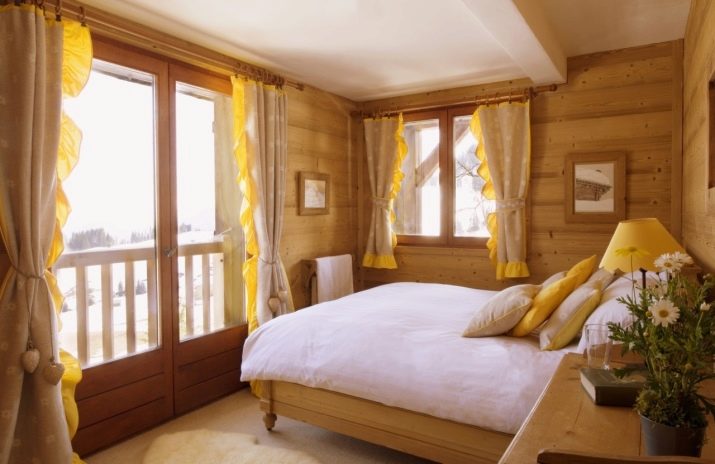 A room with log walls will complement the furniture Country style. Such a room will be decorated with fabric curtains, bedspreads or blankets. Experts recommend choosing decorative items in orange or yellow shades. The room in the style of Country looks as comfortable as possible. In such a room you can truly relax.