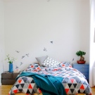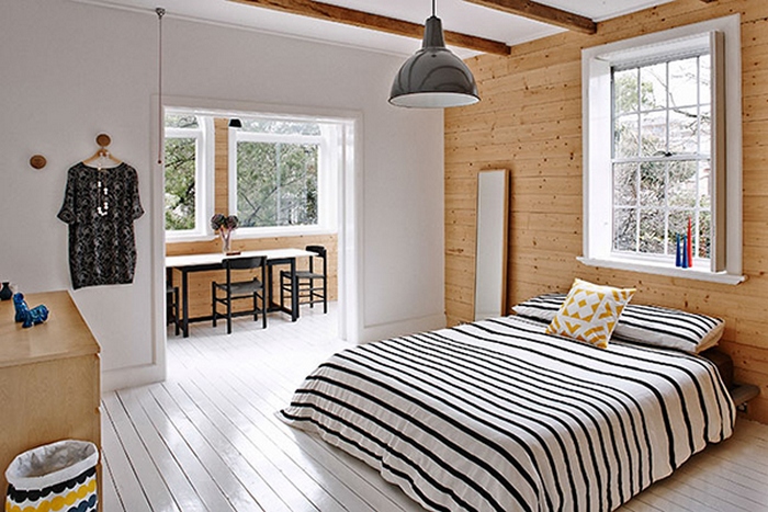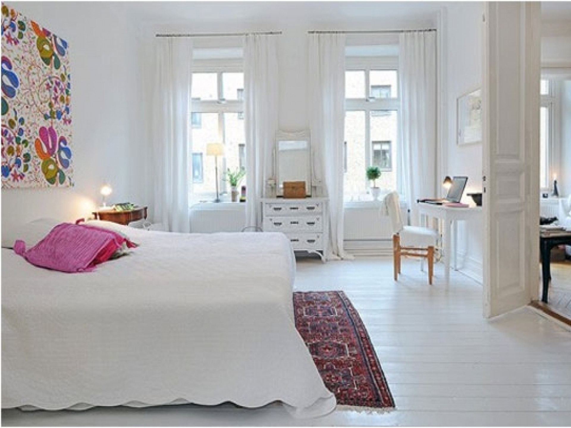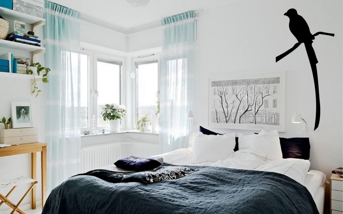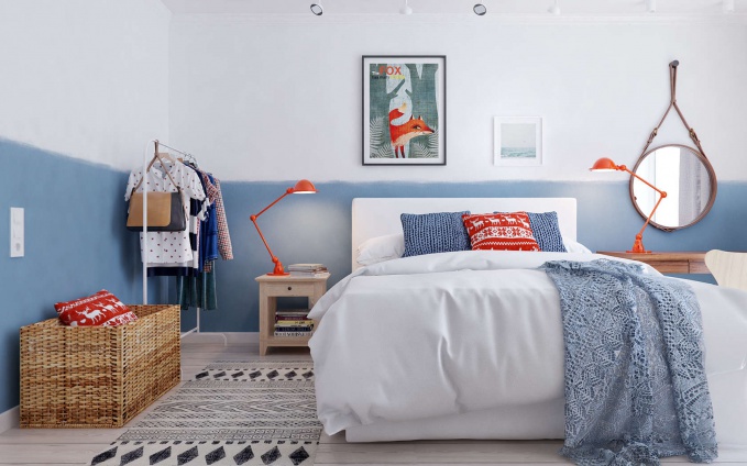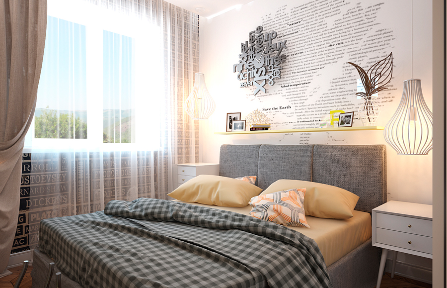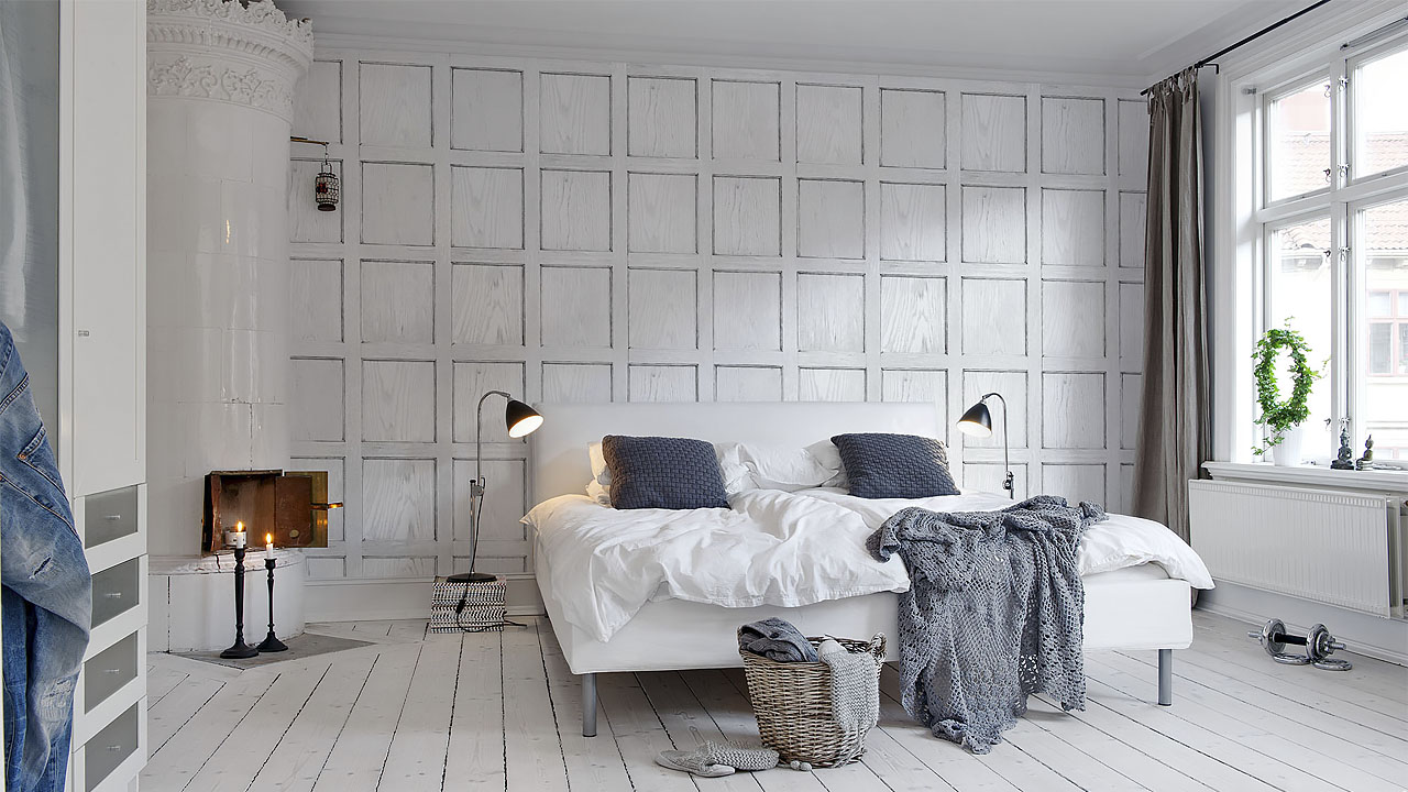 Simplicity is the main thing that distinguishes the Scandinavian style. In the bedrooms, made in this style, the walls are simply painted white (or very light shades of blue, mint, beige). Sometimes for decoration can be used stencilled inscriptions. What is important - the walls are rarely covered with wallpaper. More often they are simply plastered and painted. Scandinavian style often concentrates on the wall behind the head of the bed. The wall can be revetted with bricks, decorated with wooden panels, glued with bright wallpaper, painted with floral or other patterns.