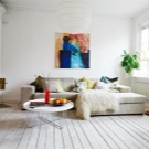 Given the overall minimalism, it is worth diluting it with a number of accessories. Ceramic figurines, colored rugs, live plants, bookshelves - options can be anything. Good will look accessories made by hand. On the walls you can hang pictures in wooden, black or dark (for example, brown) frames, pictures with images of the northern expanses and the sea.