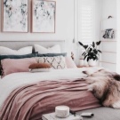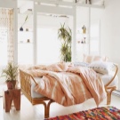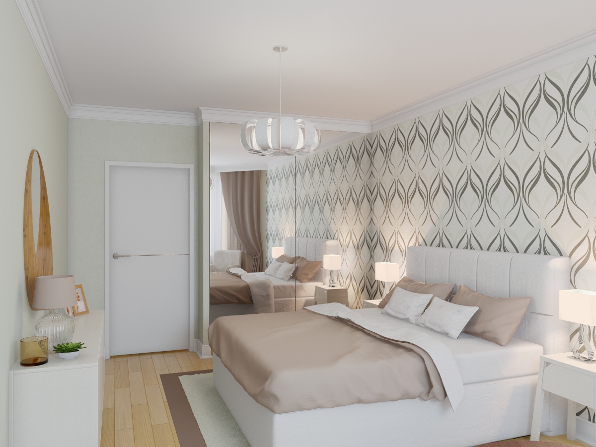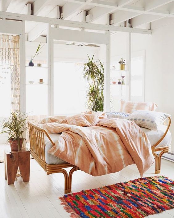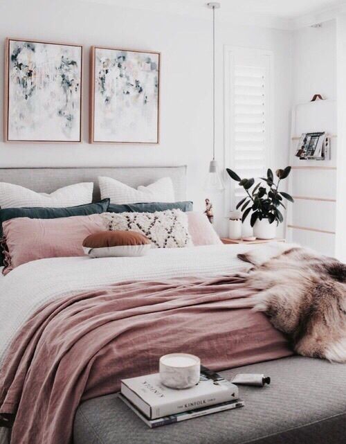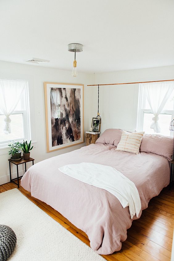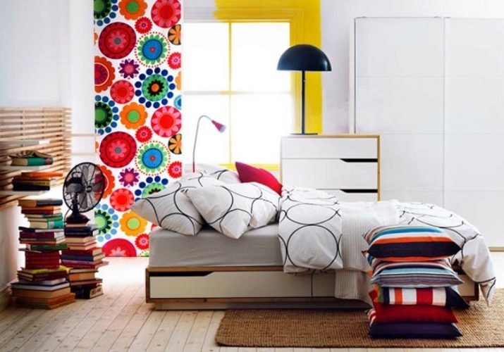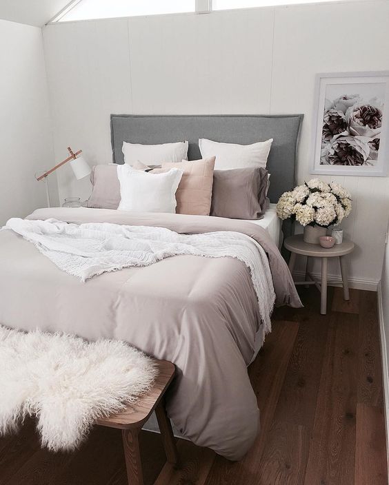 Warm tones play an important role in the bedroom. Beige and honey shades, peach and pale pink will give the room a feeling of comfort and warmth. It should avoid cold shades. Combined with the basic white color, they will make the room uncomfortable. Another way to play on the contrast is to add bright textiles to the room. Pillows or a blanket with an unusual pattern will be the perfect final touch in the design of the room.