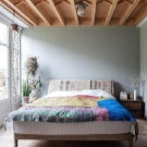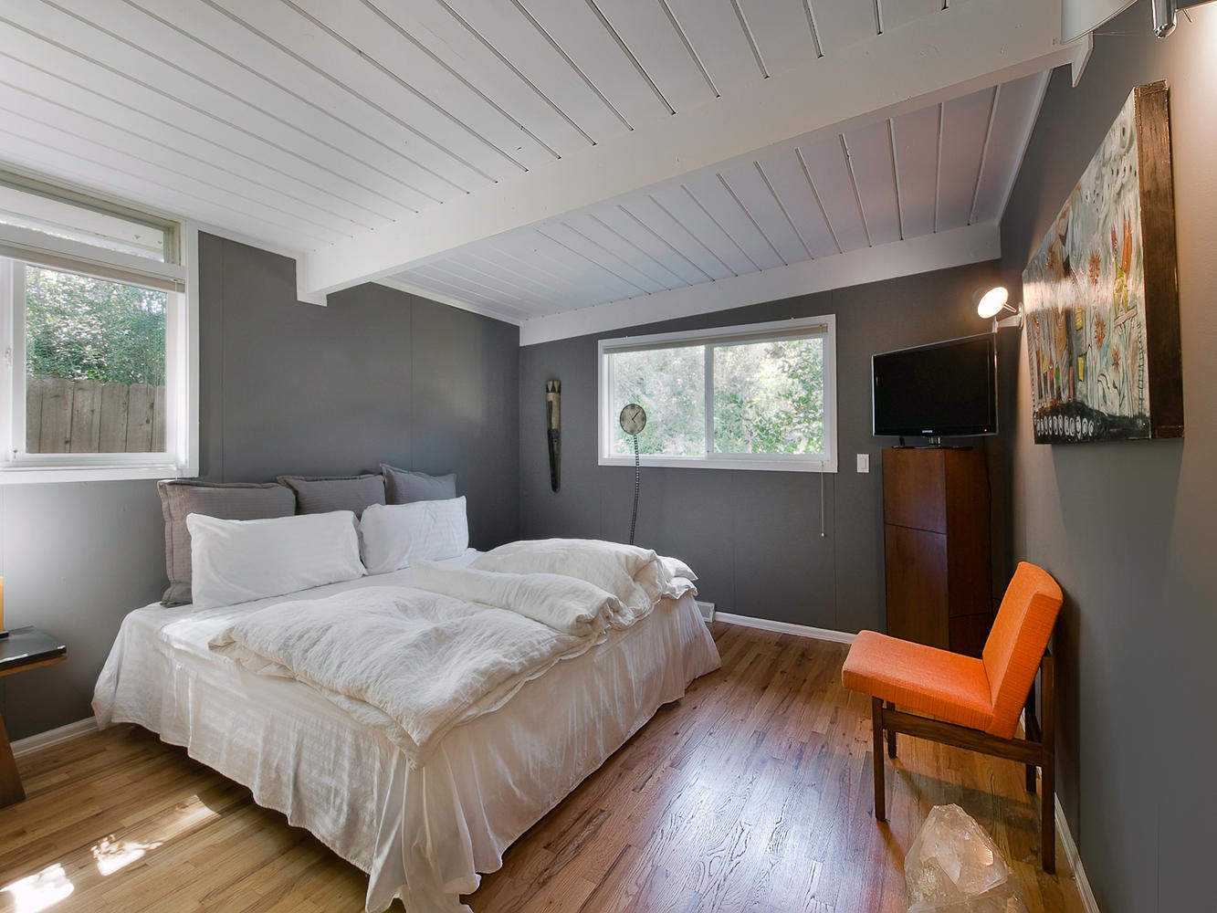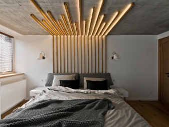 The ceiling in the Scandinavian bedroom is bright and smooth, without stucco or patterns.It is very good if it is covered with white plaster, although the use of other light shades is quite acceptable. Suspended and tensioned shelves in this style are not welcome.