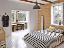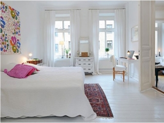 When making the bedroom in the Scandinavian style is best to use natural materials: wood, stone, glass, fur. A variety of textures will help to dilute the austerity, which is created by a small amount of furniture and an abundance of white.It is better to pick wooden products that have not been processed. Furniture can be simply varnished. The tree is environmentally friendly, so this material is chosen quite often.