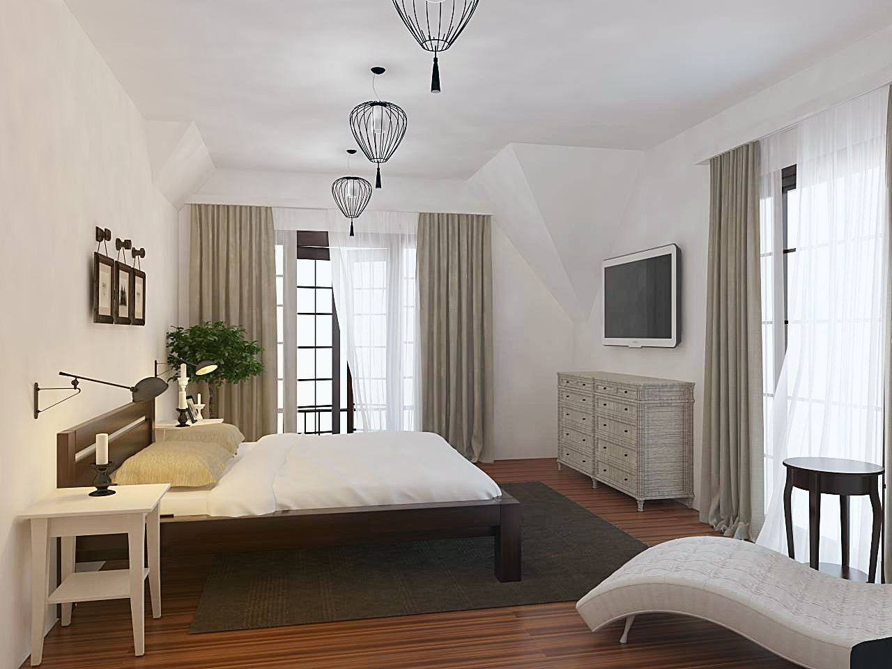 This style is characterized by the abundance of elegant textiles. Fabrics should be natural - linen or cotton. Fur and leather products will fit well into the room. It is allowed that in the rooms decorated in this style one of the walls or part of it is lined with brick. A brick wall enlivens the environment, while at the same time it looks minimalist in the right degree. Valid in the design of the bedrooms metal and plastic. They will look very good in lamps, photo frames or small figures. Metal parts in combination with natural elements (wood and stone) - again allow you to create the necessary contrast for this style. However, you should not get involved in, so as not to violate the unity of style.