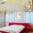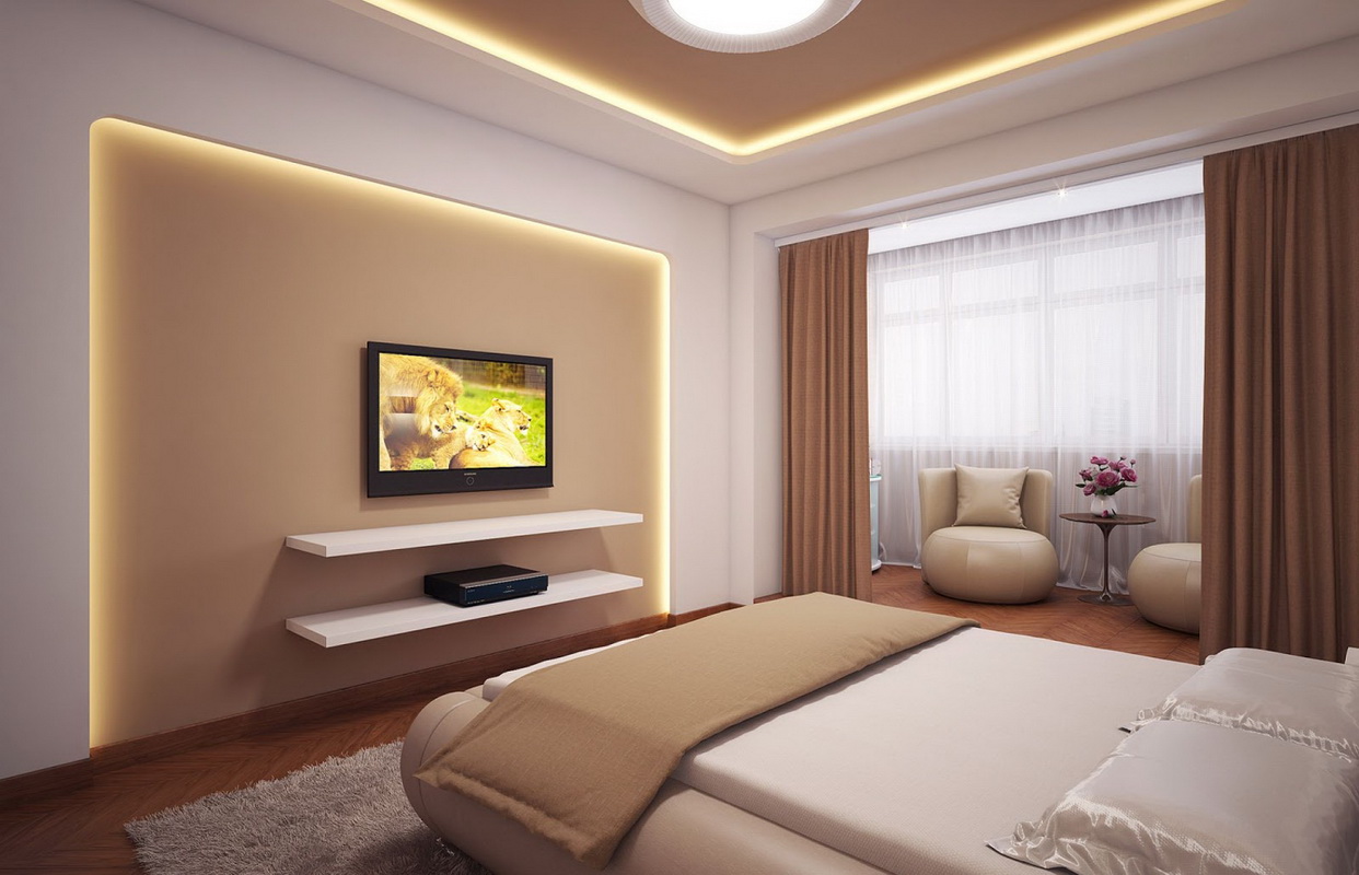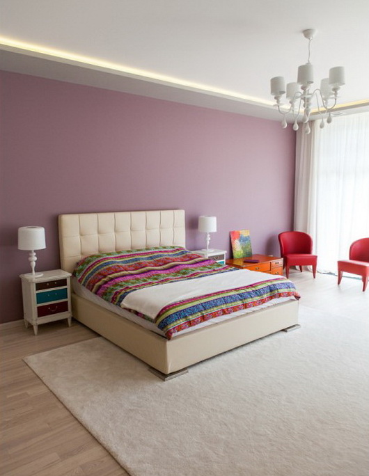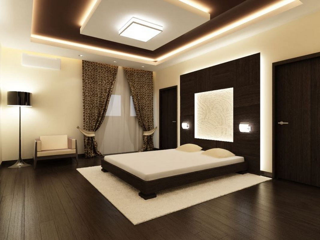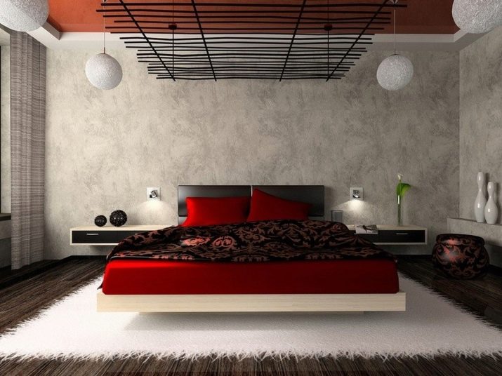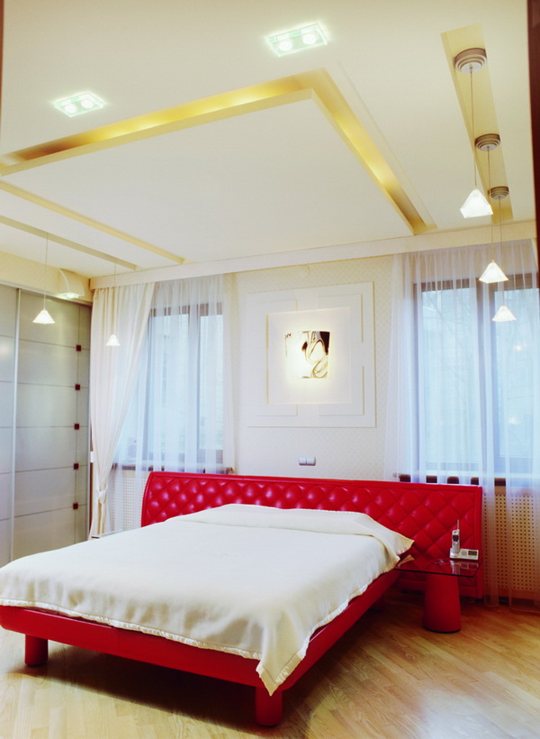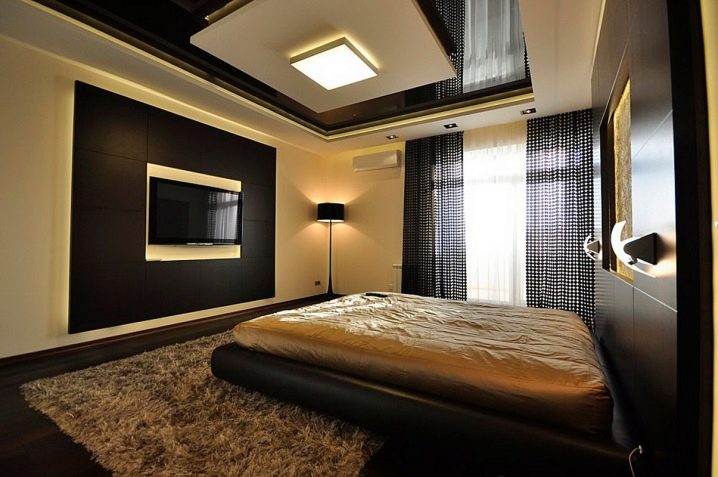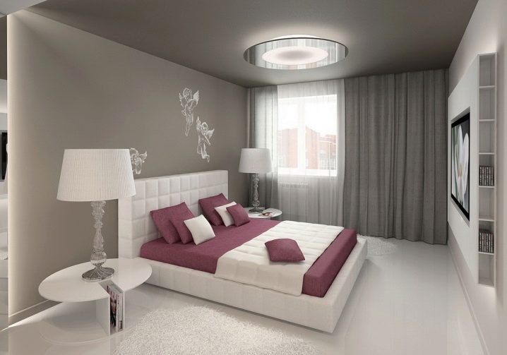 For the design of the ceiling, the designer first determines the entire color scheme of the interior, then proceeds directly to the development of the bedroom project, most often using a monochromatic stretch ceiling of a neutral shade or a regular ceiling painted in matte paint. Rarely, designers resort to creating a multi-level ceiling with hidden lighting, although this design option is the most spectacular.