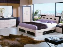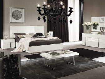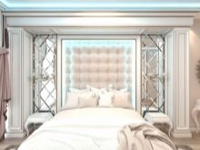 The bedroom in modern style, as a rule, uses a standard set, which consists of a bed, 1-2 bedside tables, a mirror, a chest of drawers or a wardrobe.