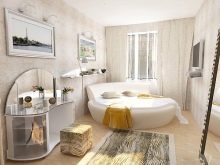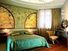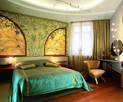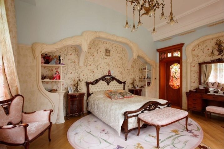 A serious representative of the stylistic orientation in the bedroom will be a mirror framed by a carved frame, as well as a picture of a modernist artist. The asymmetry in the design of the walls will add decor to the artistic concept of winding lines.