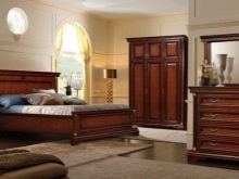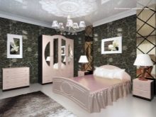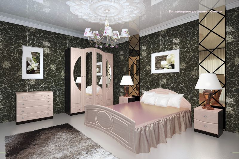 - The bedroom "Omega" is a bright representative of such furniture. This neat headset fits perfectly into a modern interior. Interesting shapes, characterized by soft roundness, are characteristic of this style. The complete set of a bedroom "Omega" is quite rich. It consists of a double bed, bedside cabinets, as well as a four-door wardrobe, the door of which is decorated with mirrors, and there is a chest of drawers in the headset. The material of the bedroom frame is chipboard, the surface of the facade - MDF. Color range: the body is made in the color of wenge is dark, and for the facades, Pentax in two versions is used - chocolate and vanilla.