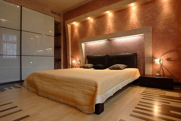 The wall to which the bed is placed can be artistically decorated, which will create a focal point. Decorative partition, wall details or headboard can be effectively beaten with soft upholstery