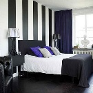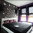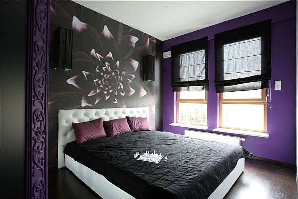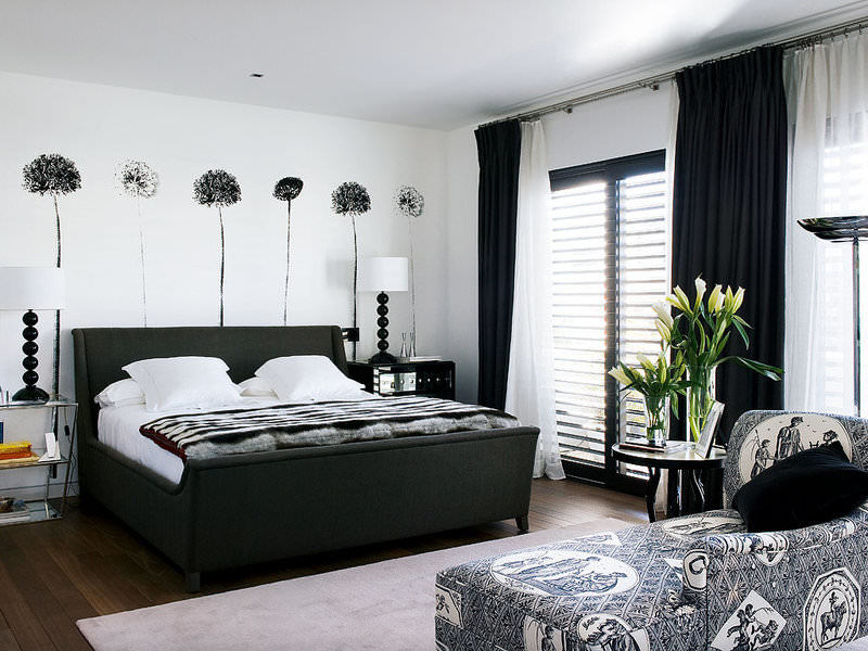 The opposite design option for a small black and white bedroom is the use of a very sharp contrast. There is no place for the color transition: only one wall is painted in black, the other surfaces are white. This technique keeps the visual space, and with the help of black creates a calm atmosphere. If you add a print on the curtains, textiles, a floor lamp, you can fully immerse yourself in the mysterious atmosphere of black.