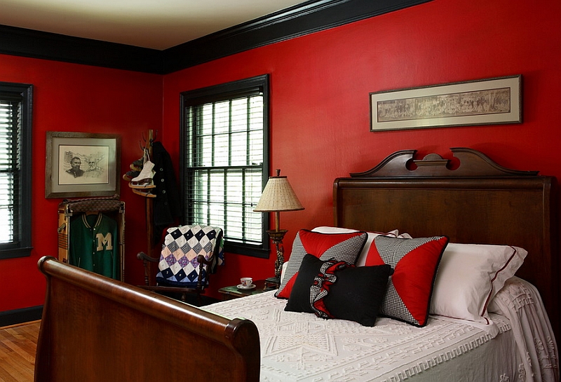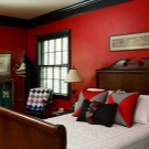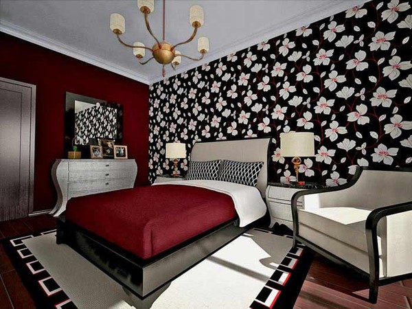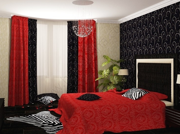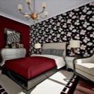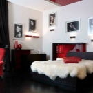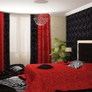 The combination of several colors (black, white, red) shows creative individuality, making the interior unique. As an accessory, a fluffy bedspread can soften the impression of this interior.