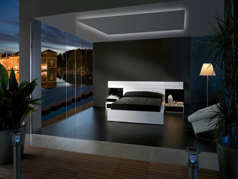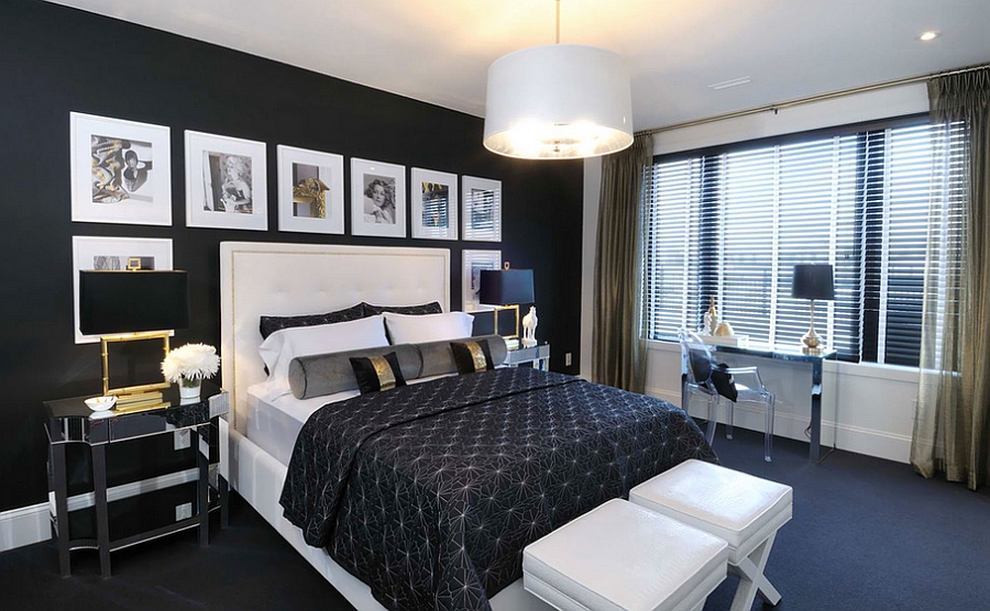 A bedroom with white solo gives the impression of coolness, while black complements and accentuates.