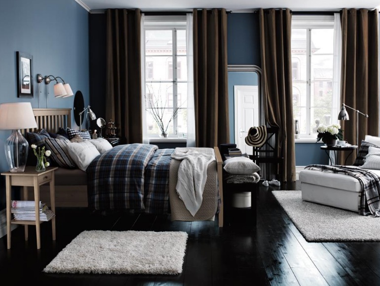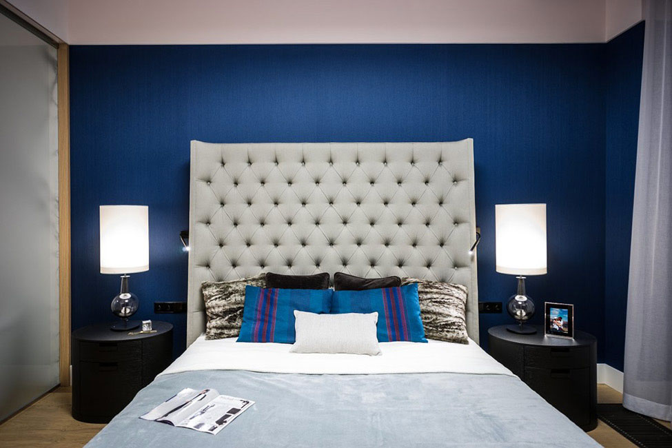 It will turn out an easy and gentle bedroom if to add black with blue, neutral gray.