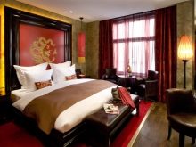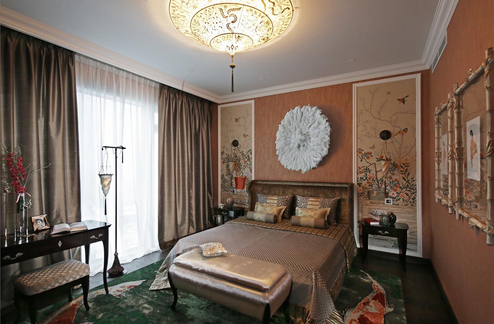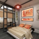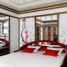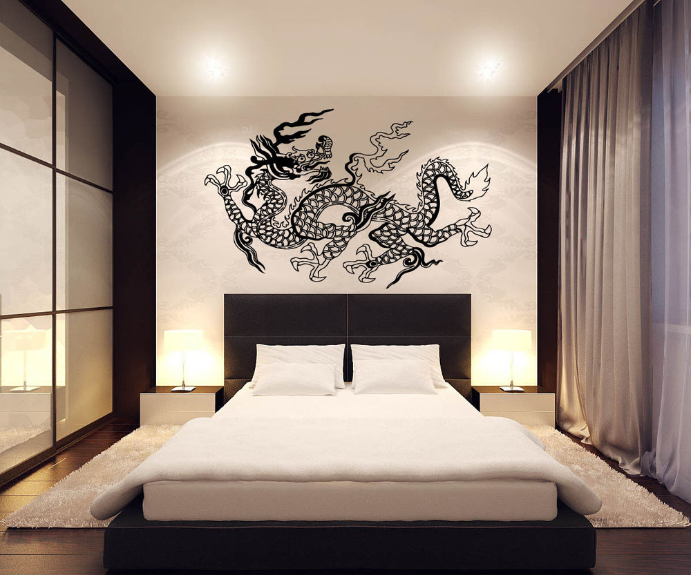 Bedroom in the Chinese style is made in a restrained color scheme. Characteristic elements are a low spacious bed and a closet with partitions. The emphasis is on the image of a dragon on the wall in typical Chinese painting technique.
