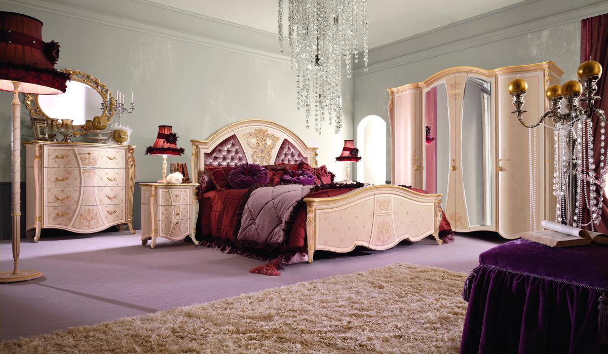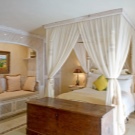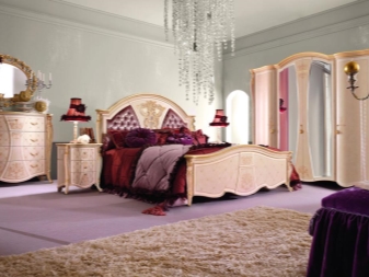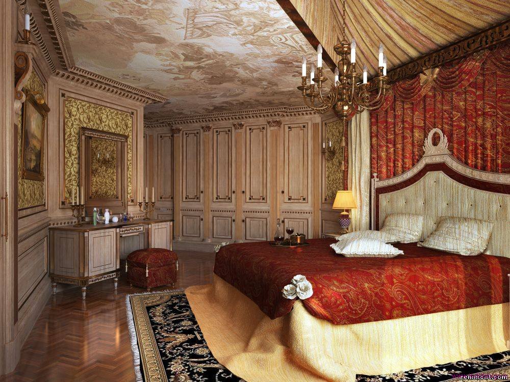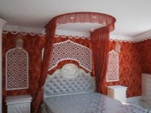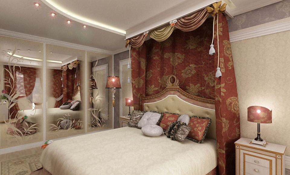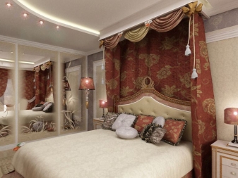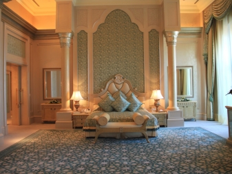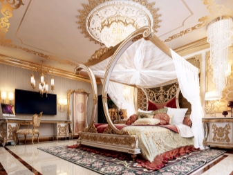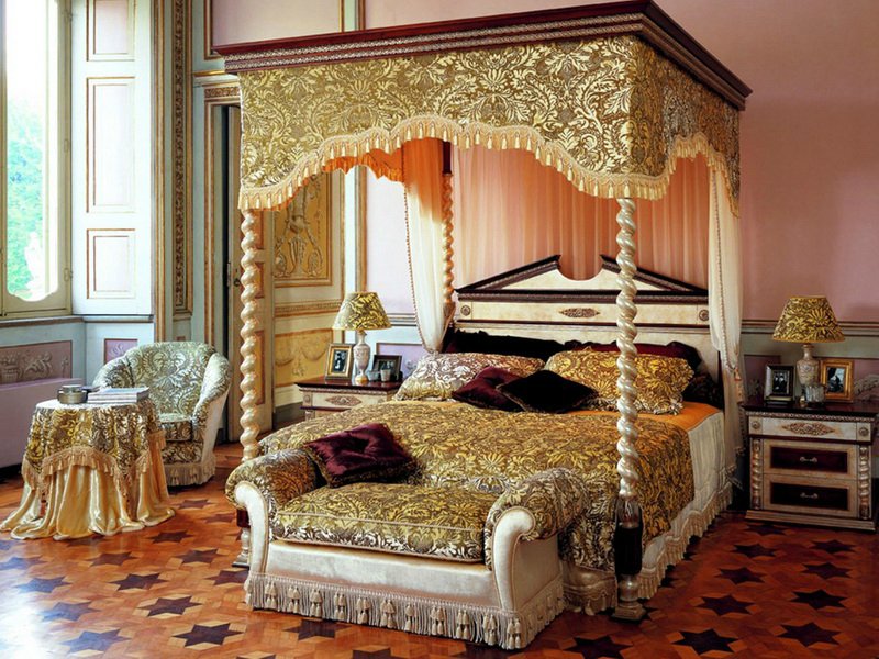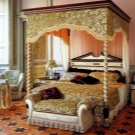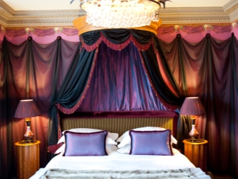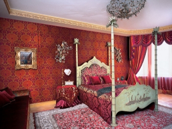Since the bed is a central element of design, it should be decorated elegantly. Attention must attract headboard. It can be massive, made of carved wood with inlays. The canopy above the bed should resemble a tent and be made of expensive heavy fabrics, such as velvet or silk. In truly rich interiors, the columns of the bed are decorated with carvings, inlays of precious stone or even elephant tusks.