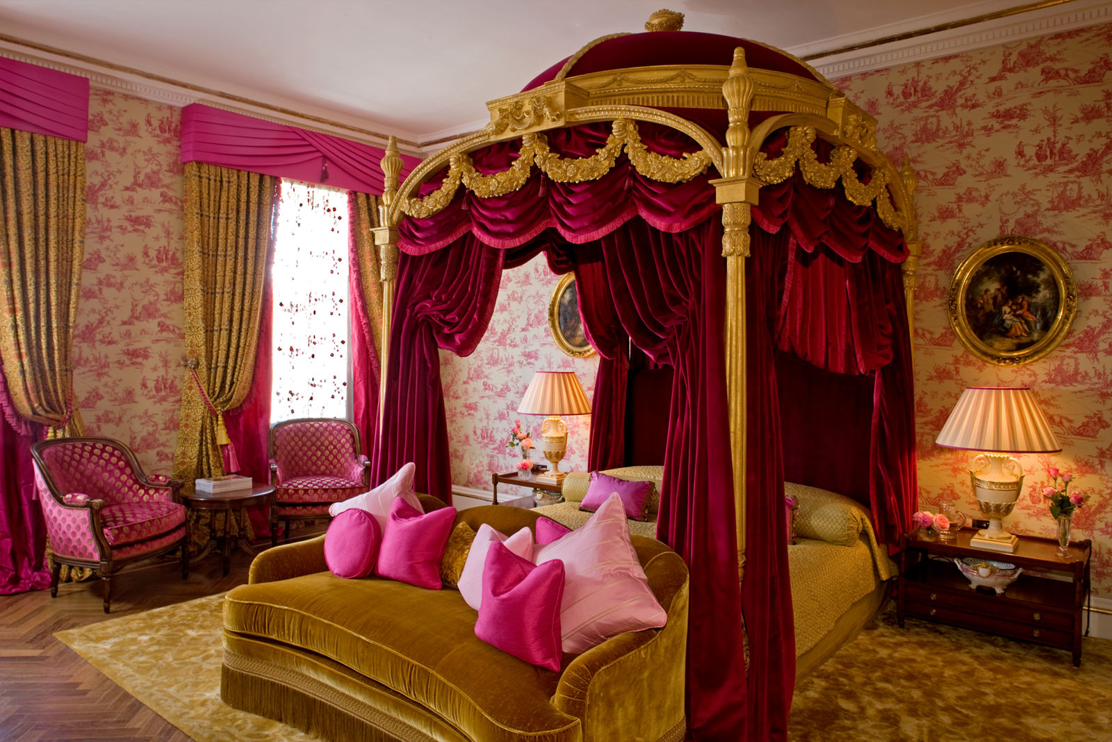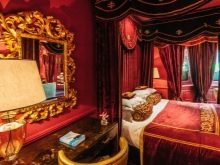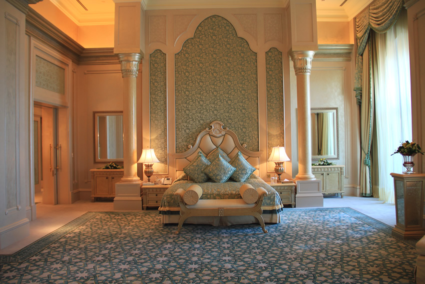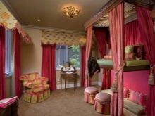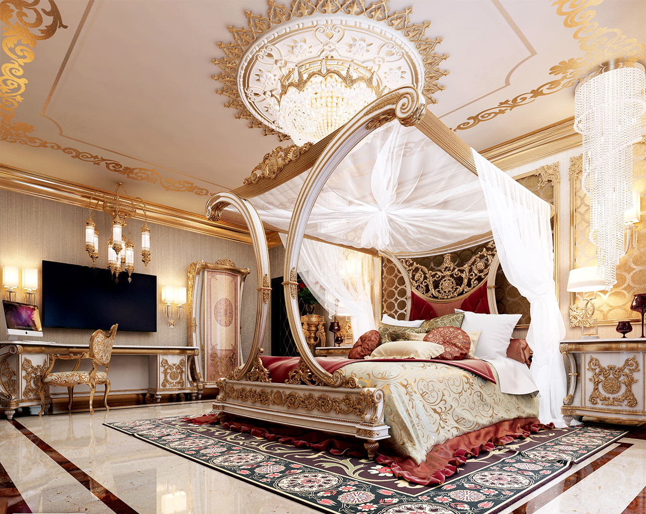 Since the bed is a central element of design, it should be decorated elegantly. Attention must attract headboard. It can be massive, made of carved wood with inlays. The canopy above the bed should resemble a tent and be made of expensive heavy fabrics, such as velvet or silk. In truly rich interiors, the columns of the bed are decorated with carvings, inlays of precious stone or even elephant tusks.
