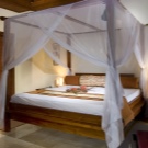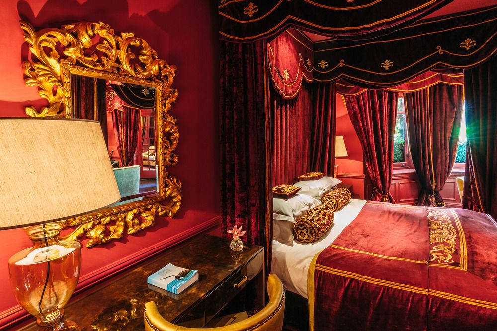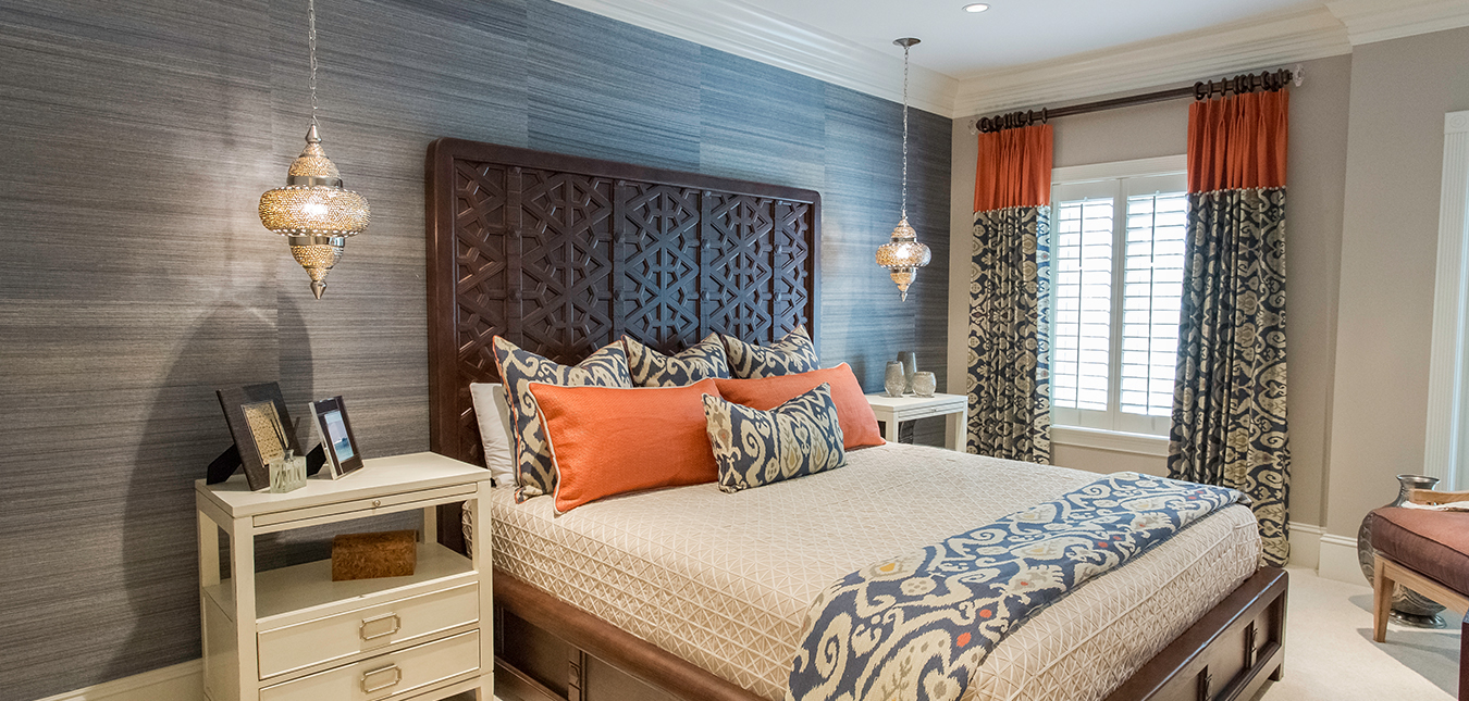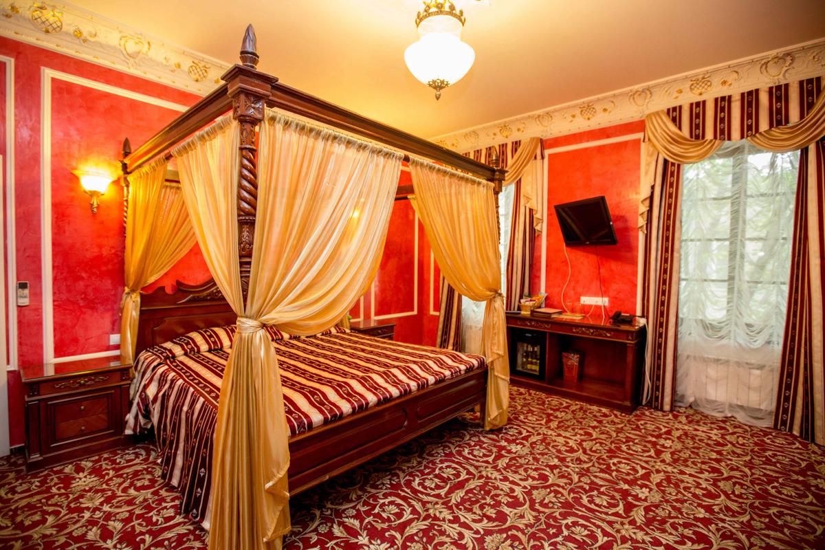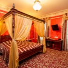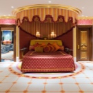 The most expressive detail of the interior is a luxurious wooden headboard, covered with carvings. It is worth paying attention to how beautifully the octagonal tables look like bedside tables. The repeating pattern in the room textile gives it a resemblance to a treasure box.
