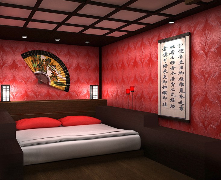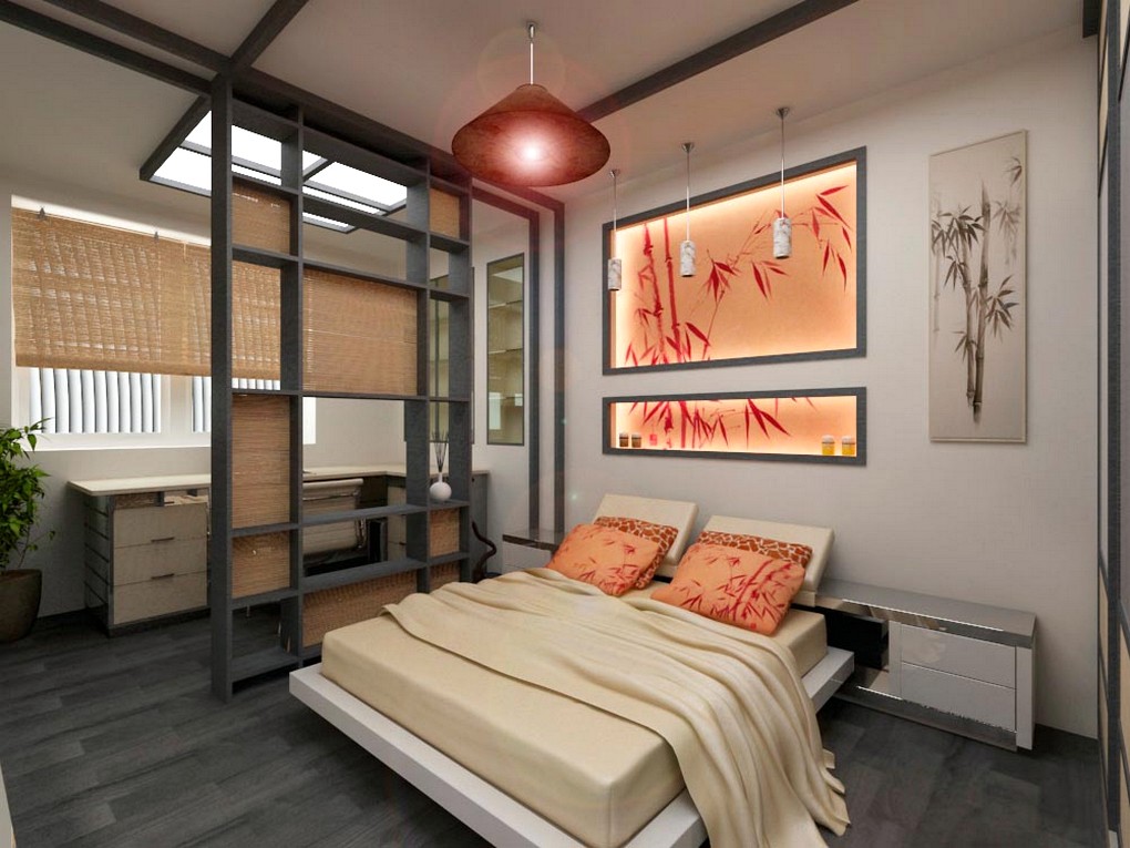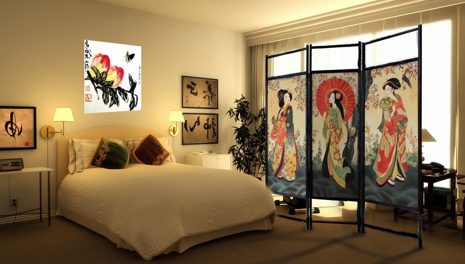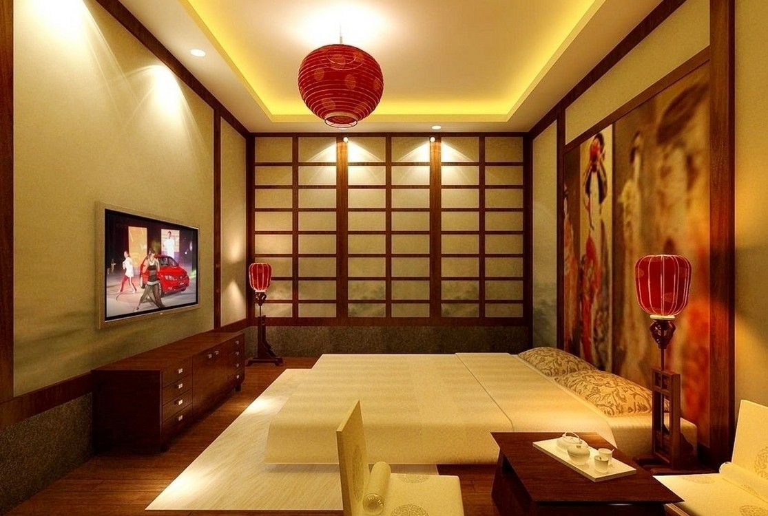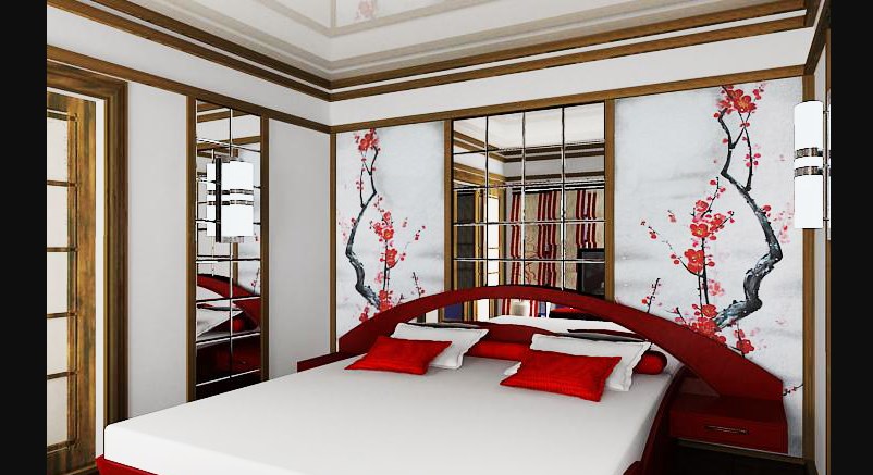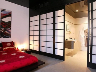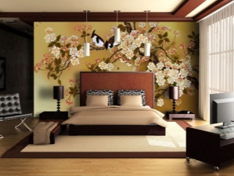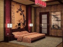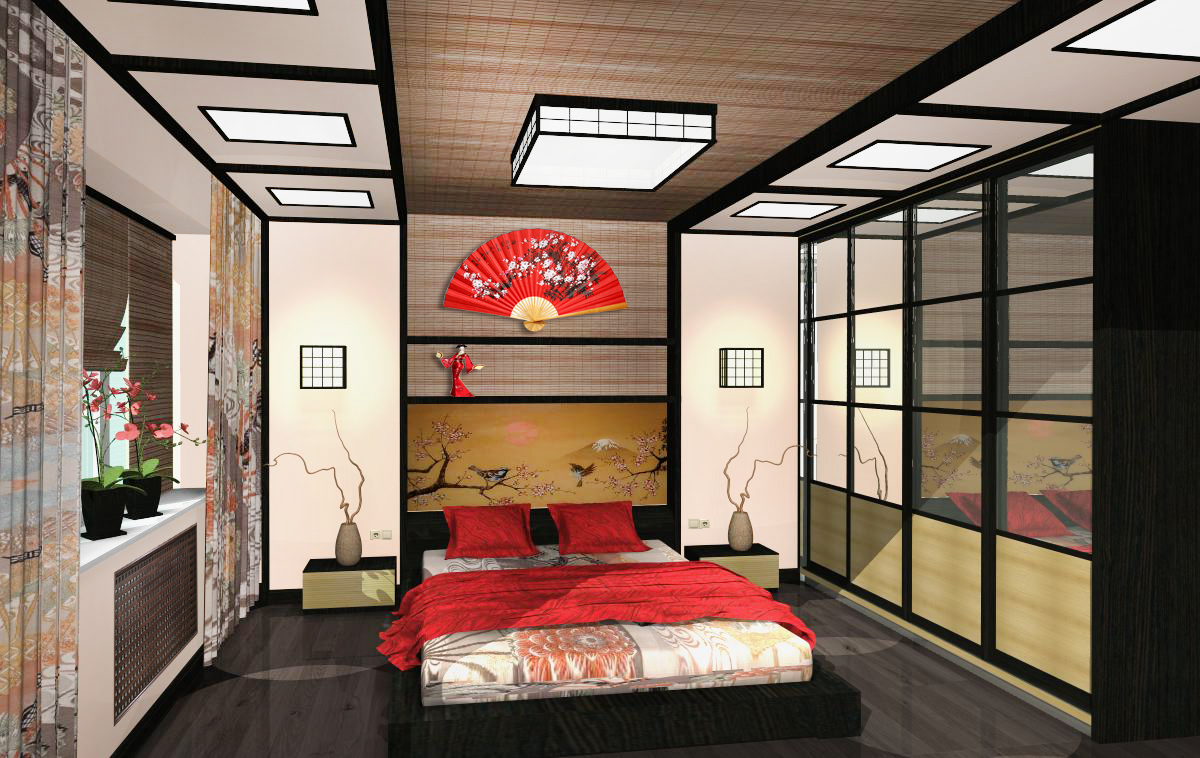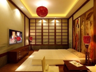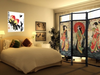 The paintings used are images of Japanese palaces and pagodas, sakura, lotuses, samurai, the sun. You can diversify discreet interior screens with traditional motifs. Japanese weapons will also look organic in such a room.