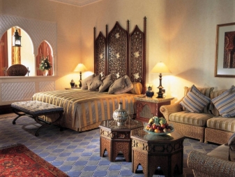 Bedside tables can be replaced with characteristic polygonal Arabic tables with inlays or chests, which will give the interior even greater originality. They are installed on the lamp, suitable for style. It is permissible to hang Moroccan forged lamps above them, which are as functional as they are beautiful.
