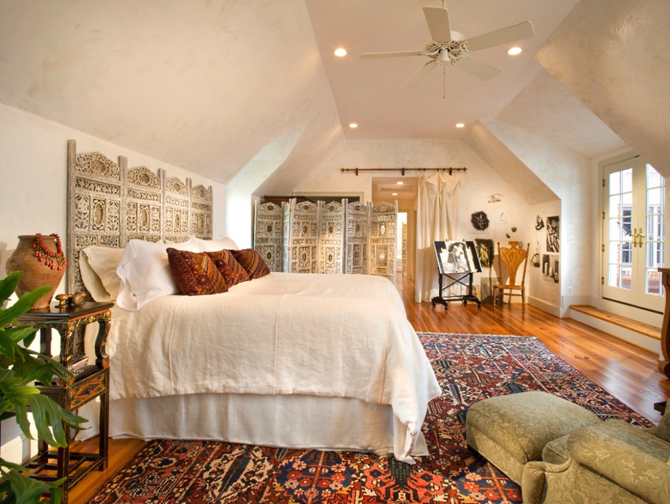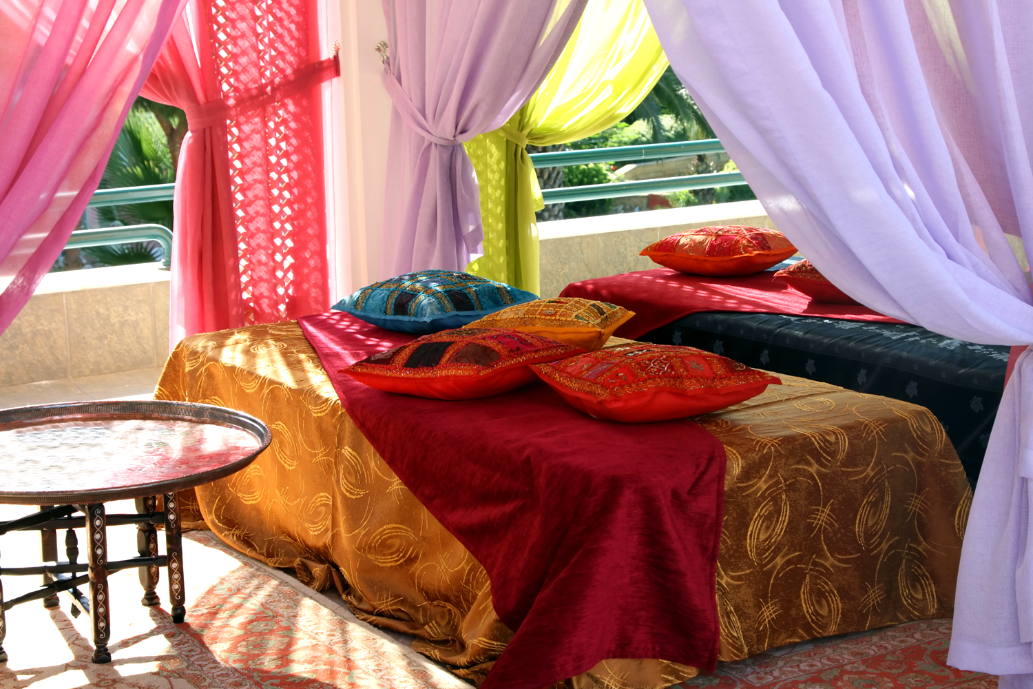 The easiest way to start is with bedspreads and pillows. Patchwork blankets of bright colors or embroidered bedspreads with tassels will remind of faraway countries, as well as pillows made of velvet or iridescent chiffon.