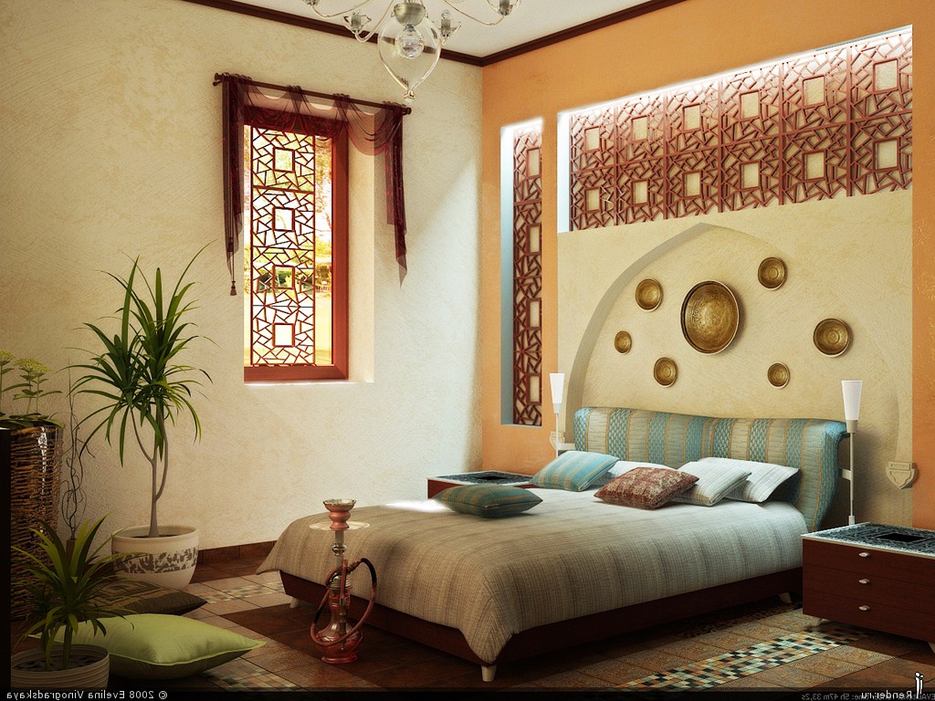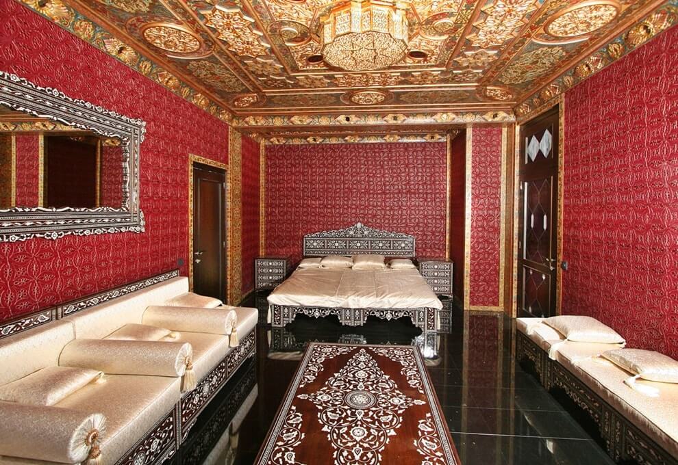 A small bedroom looks impressive due to the use of juicy shades. Oriental accessories complete the look. A glance touches the gold-written Arabic script on the wall. This is a true authentic Oriental interior.