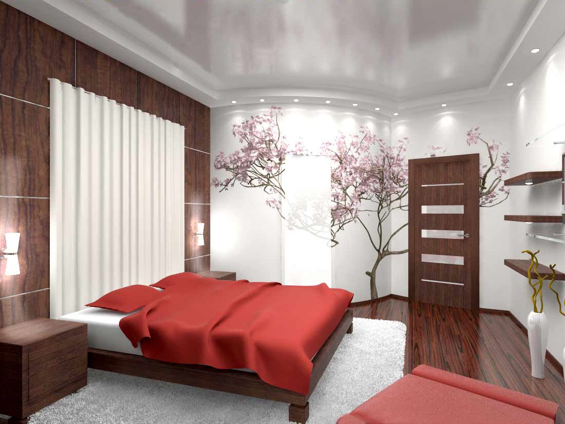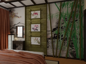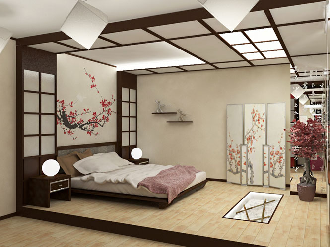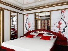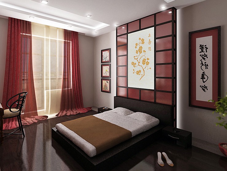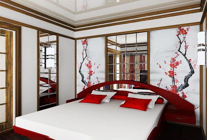 Large fans or samurai swords will look good on the walls. Perhaps the use of paintings made in the Japanese style. Traditional sakura can also decorate the walls of your bedroom.