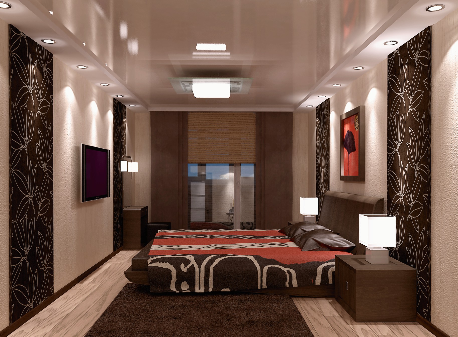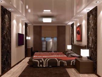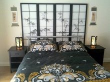 Since in the Japanese tradition walls in the rooms are replaced by light partitions (shoji),made of light wood frame and paper, in the bedroom, decorated in this Asian style, you should use either light wallpaper or wood panels that will look like traditional screens. These materials can be replaced with a special paint, on which a stencil pattern can be applied. Another option may be natural fabric. The latter method is considered the most expensive, but also the most comfortable.