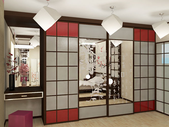 Instead of bulky and space-occupying wardrobes, the Japanese use wall niches that are covered with panels - in the style of a wardrobe. It is possible to use small shelves for storing souvenirs. A small table for the tea ceremony will also transform your room.