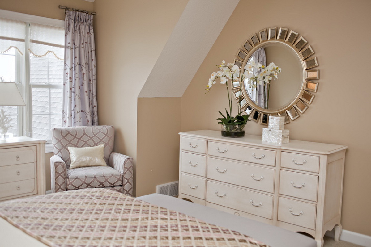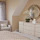 The classic bedroom can be decorated with oval mirrors in a refined frame in a light tone. White or silver design will look fresh and interesting.This is also suitable for finishing in pastel colors. It is important that the color of your choice be combined with the overall range in the room. The metallic frame will perfectly fit into the high-tech bedroom. If you are dealing with Minimalism, then pick up the classic color of the frame. It is important that it does not have additional decorative elements.