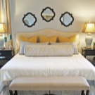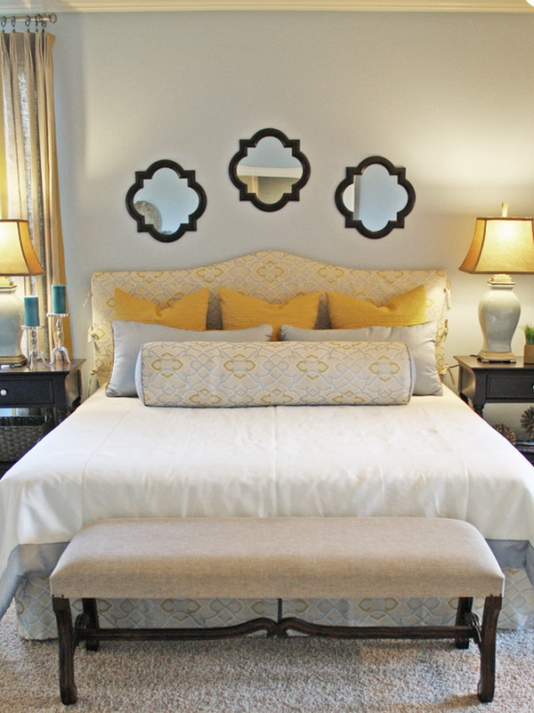 - Geometry. The rhombus decor can be called a classic arrangement of wall mirrors.Such an unusual decision will make your bedroom play in a new way. Beautiful mirrors at the head of the bed look particularly advantageous.