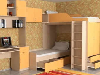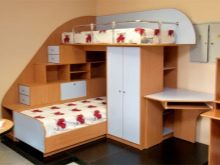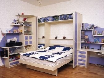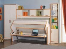 Usually the table and small drawers are located on the same side of the wall, and a wide wardrobe continues this design on the adjacent one. There are very unusual models in which cabinets folding beds are hidden. This product with a folding bed, which is located inside the cabinet. It can be located both above and below.