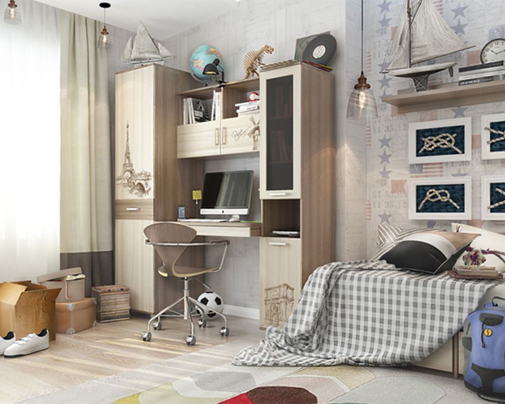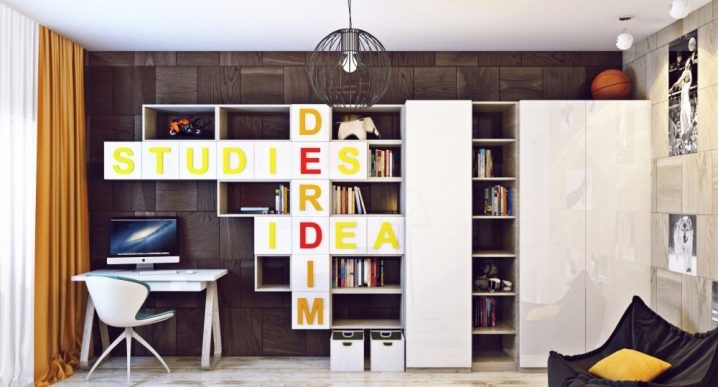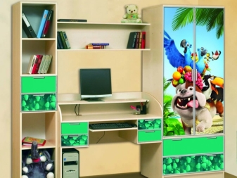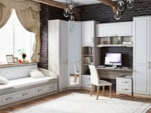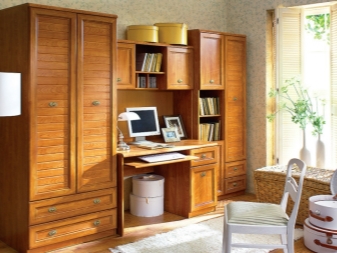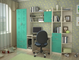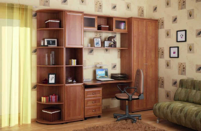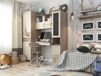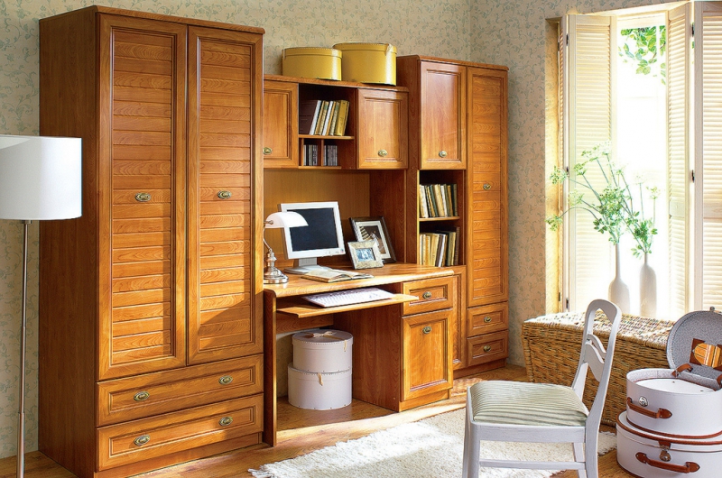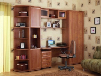 The design of the cabinet can be any. This may be a wardrobe or a more classic design with hinged doors. Also, manufacturers usually complement this set of shelves, which, as a rule, are located above the desk. Moreover, the entire wall may have a conventional rectangular or angular structure.