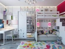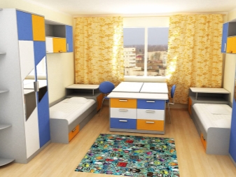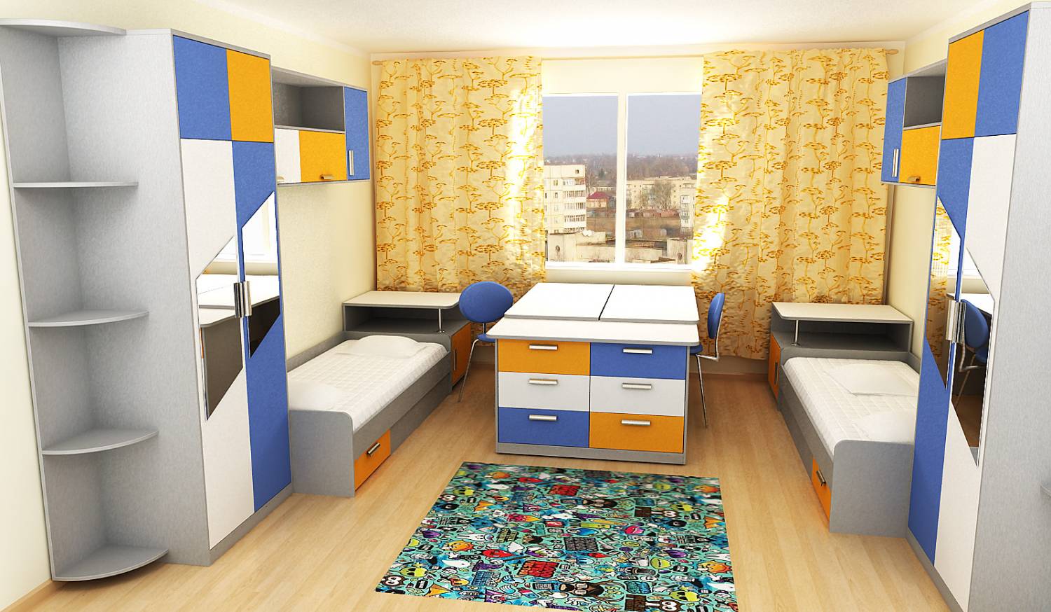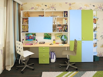 If you have two children, you need to buy a larger and more spacious furniture. This can be a joint wall with two tables or any double-sided model. Many people use the latter option for zoning a children's room for two children. There are even models with wide cabinets that have a twin construction. Their doors open from both sides at the sides.
