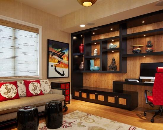- If you want to make the interior of the whole house in ethnic stylethen the nursery can be interestingly decorated in the eastern style. Usually such walls with tables and cabinets are distinguished by unusual shapes and smooth lines. Many also decorate them with picturesque abstract images. In order for such a piece of furniture to fit perfectly into the nursery in an ethnic style, you can arrange figurines on oriental themes on the shelves.