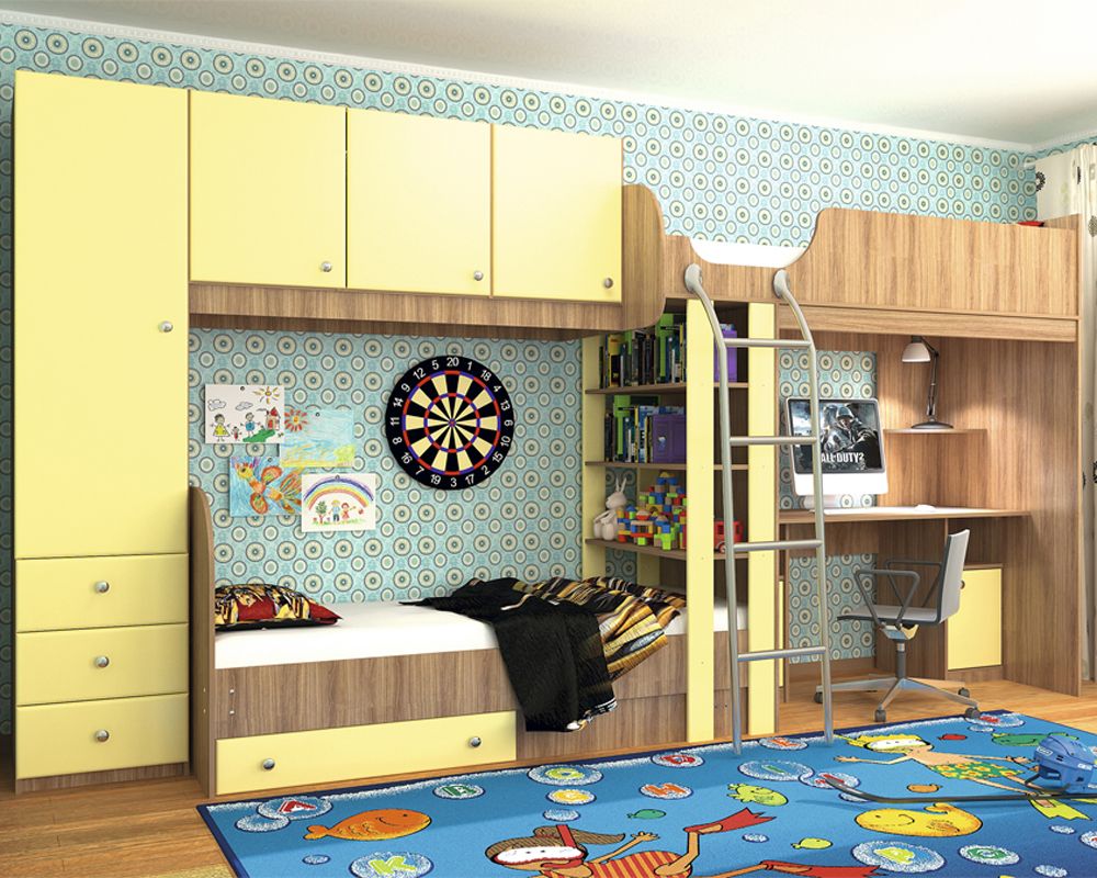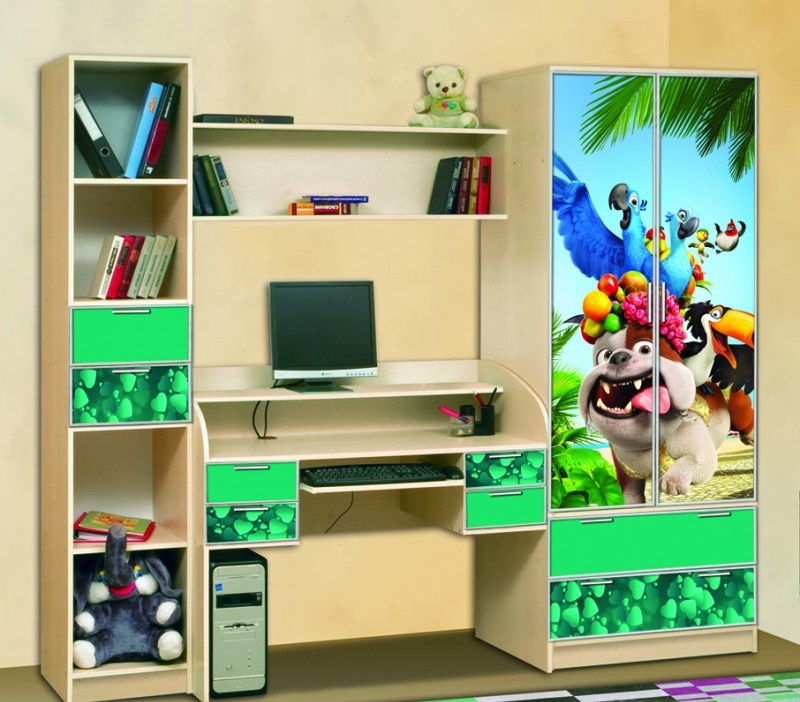 As a rule, a children's wall with a table and a wardrobe includes in its construction several rather large-sized elements. First of all, this furniture set includes a large closet and a written or computer desk. Also, some manufacturers include beds that can be located on the first or second tier. As for the cabinet, it is quite roomy and has hangers for clothes, as well as shelves and drawers in which you can put all the personal belongings of your child.