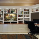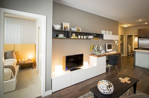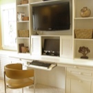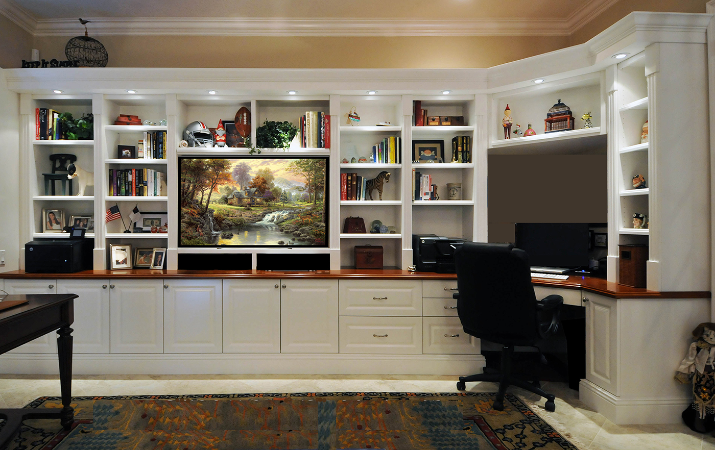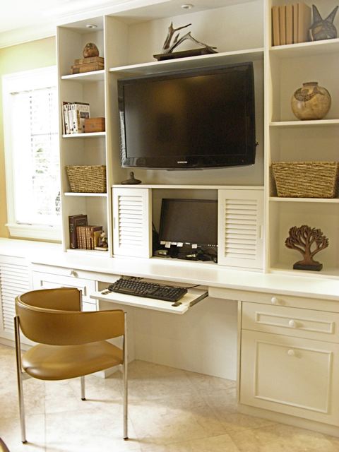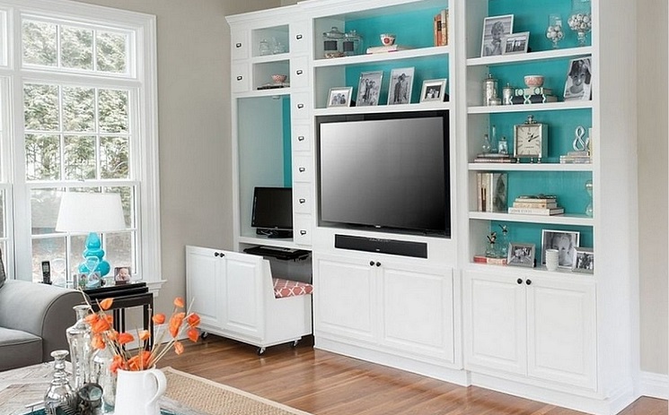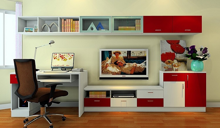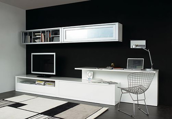The mini-wall for the TV is equipped with retractable shelves or secretary. You can try one of them to use as a mini-office.