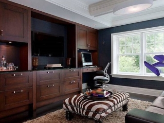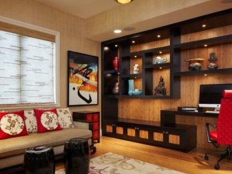 - Insulation. The limited usable space, as well as the need to isolate the workspace for successful work, makes it necessary to clearly define the boundary of the working area. The space is distinguished by architectural means: a niche, a bay window, a podium, part of a suspended ceiling, as well as with the help of furniture, decor, bright carpet.