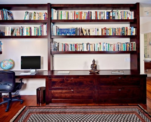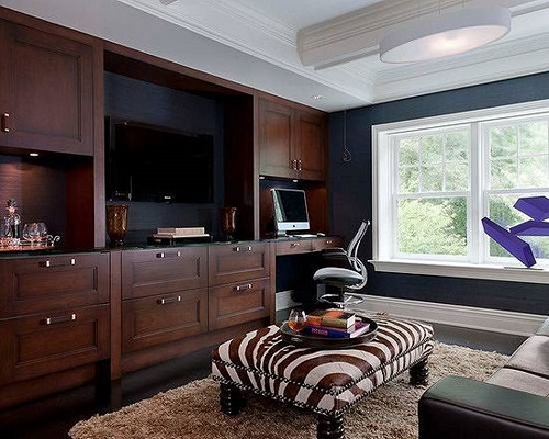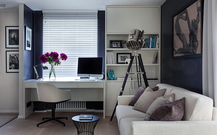 It does not spoil the interior, and creating a workplace does not take much time. The wall can be with a built-in desk for a computer or combined with a workstation for a computer.