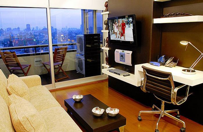 In a small apartment, where there are few rooms or even one, the living room plays several roles at the same time, and it is the bedroom, the dining room, and the office. And then it is the wall with a computer desk that has such variations that allow it to be used as a multifunctional object.