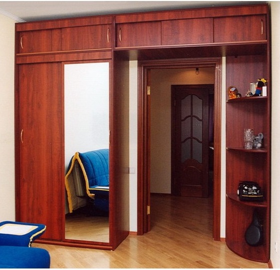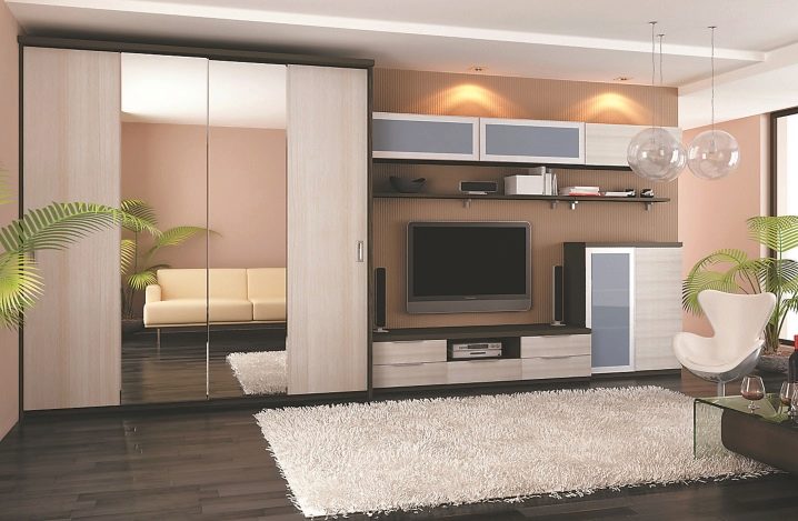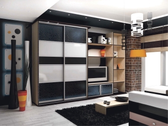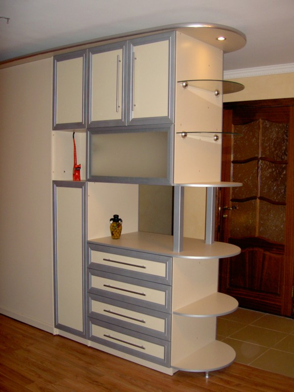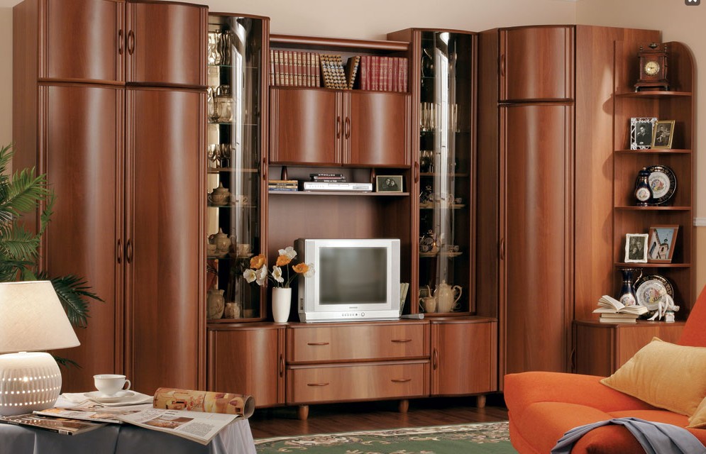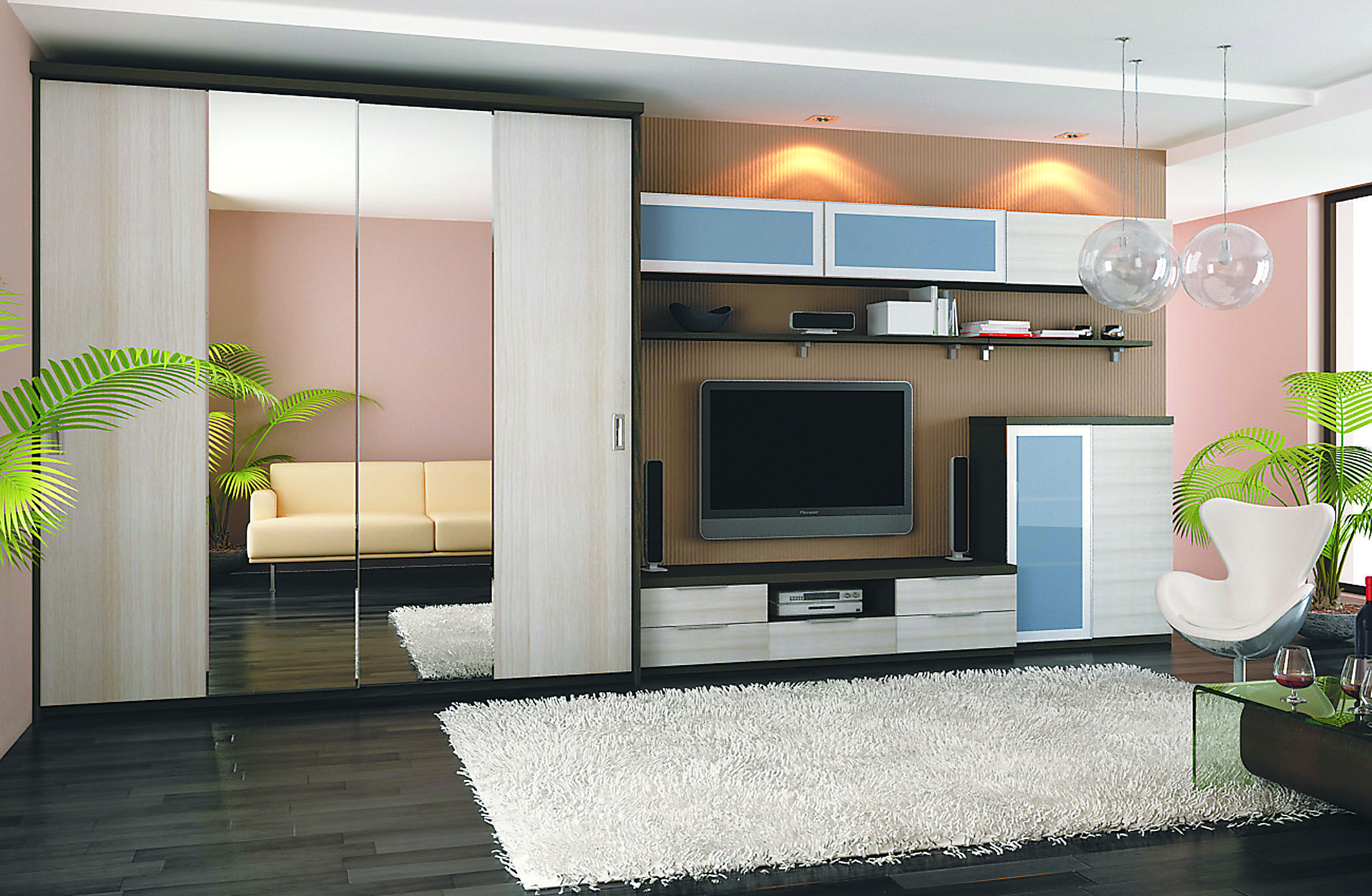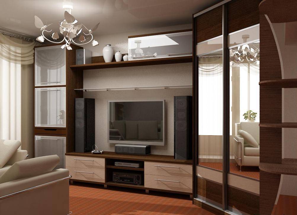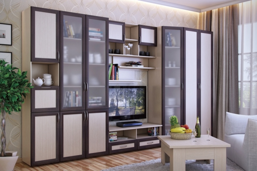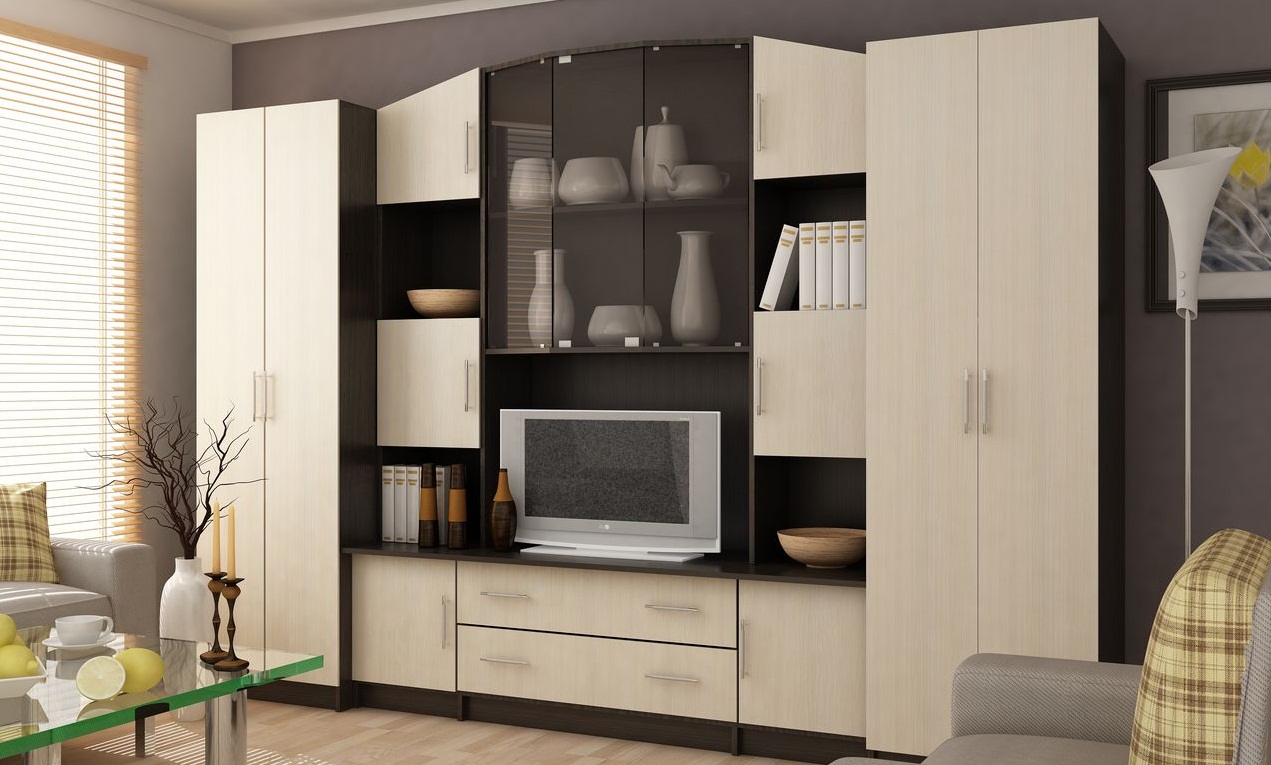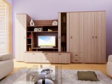 For one-room apartment the best option would be a compact wall, which does not include a cabinet due to the fact that there is a possibility of excessive cluttering of space.In this wall is usually built in the space under the TV, combined with a chest of drawers in the form of several deep drawers, as well as shelves for books and souvenirs. Designs can be given an additional lightness, having issued one or two sections of the shelves with glass doors. As for the necessary wardrobe, in order for it to fit in an apartment, the best way out would be to place it in the corridor by ordering a separate spacious wardrobe.