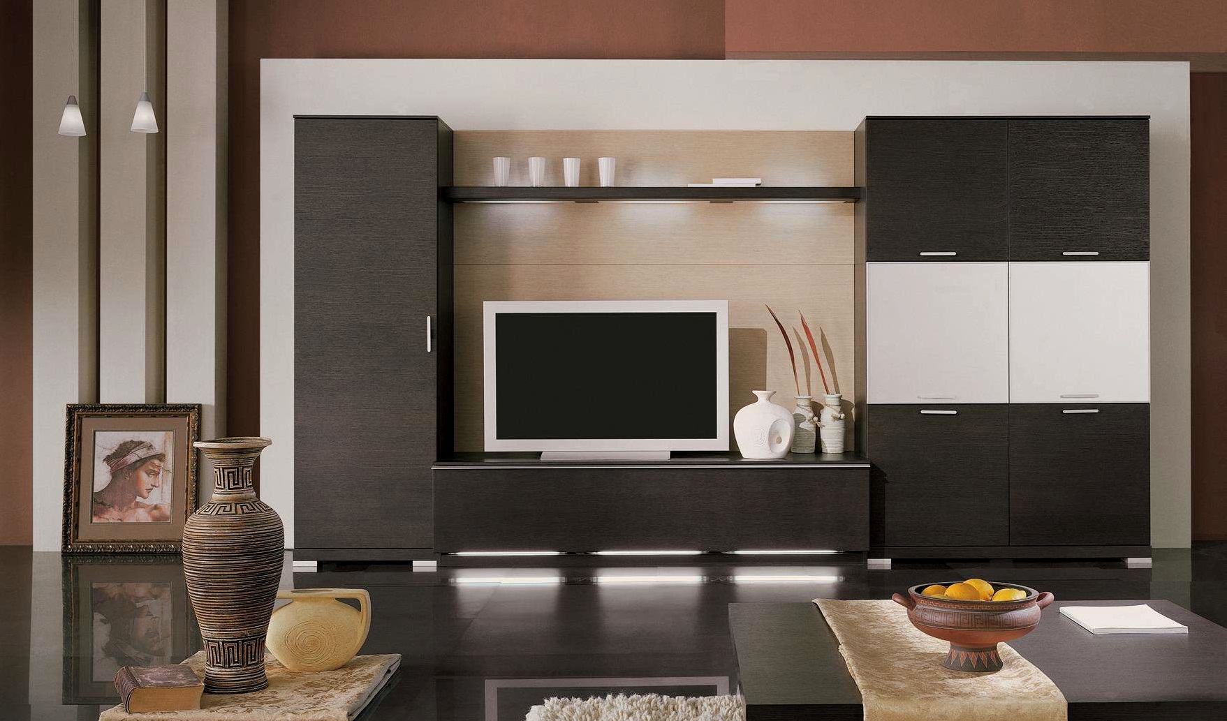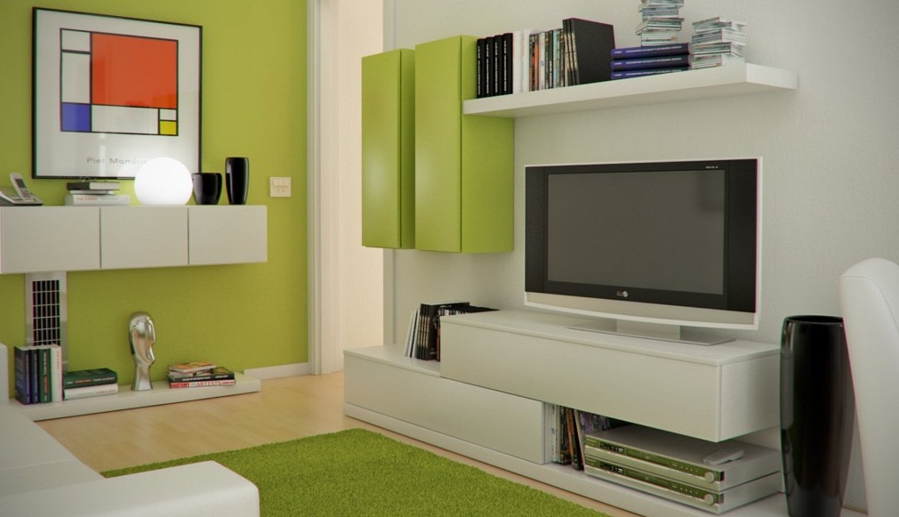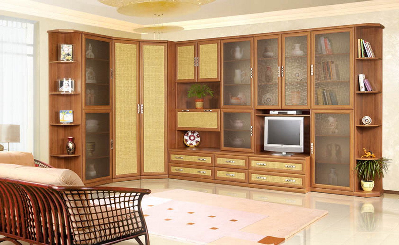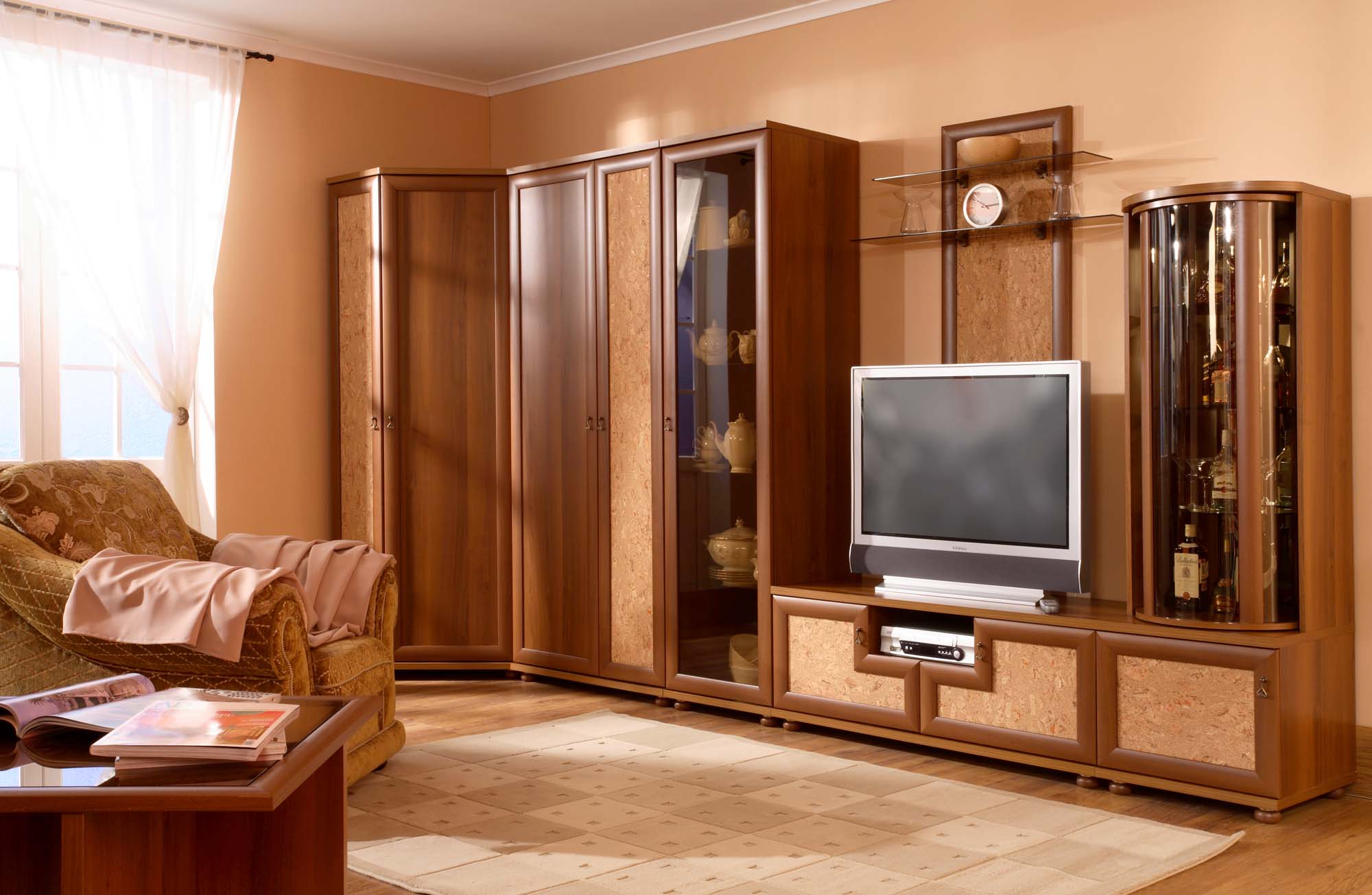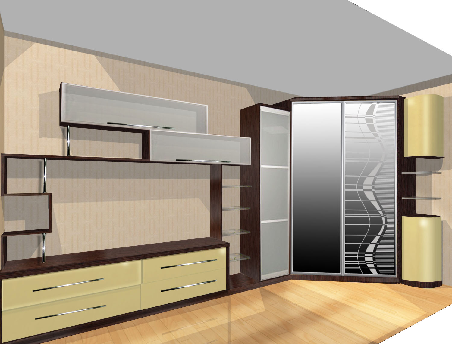 For one-room apartment the best option would be a compact wall, which does not include a cabinet due to the fact that there is a possibility of excessive cluttering of space.In this wall is usually built in the space under the TV, combined with a chest of drawers in the form of several deep drawers, as well as shelves for books and souvenirs. Designs can be given an additional lightness, having issued one or two sections of the shelves with glass doors. As for the necessary wardrobe, in order for it to fit in an apartment, the best way out would be to place it in the corridor by ordering a separate spacious wardrobe.