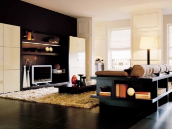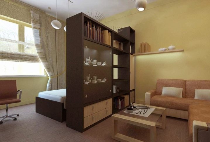 There are walls that, besides the main one, also have a separating function. Of course, for many people this way of dividing the space into two parts (living room and bedroom) is perfectly familiar from old times, when large rooms were divided in two in this way with the help of massive Soviet cabinets or heavy modular drawers mounted on top of each other. At the present stage, there are specially designed for such cases, light shelving separators, where, if desired, you can put books or souvenirs.However, if there is a desire to separate the space with a kind of monolithic block, a narrow cabinet and several lightweight modules in the form of dressers, drawers and shelves will be a good way out.