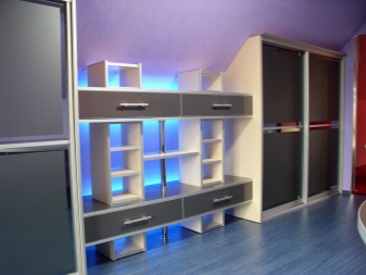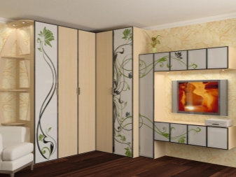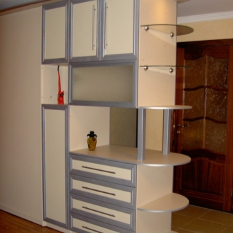 The cabinet can have one leaf or two - depending on the size of the corner space and the individual wishes of the owner. Often, angular designs are decorated with at least functional shelves that have a peculiar chaotic "spread" over the space surrounding the key unit in the form of a cabinet (a typical sign of the now fashionable stylehigh tech). The shelves come with a design in the form of a slide, and below can be placed more massive pedestals or chest of drawers.