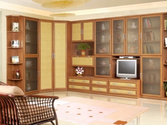 The walls are subdivided already on the basis of what main functions they perform in the house. Corner means placing the largest element (cabinet) in the corner, most often for the sake of saving the surrounding space in small and small-sized "Khrushchev" and studios. However, it would be wrong to assume that the angular design is intended solely for the purpose of economy. With proper planning and design, corner cabinets can look presentable, beautiful and modern in large rooms, especially if they are harmoniously complemented by other modular elements in the form of cabinets and open hanging shelves.