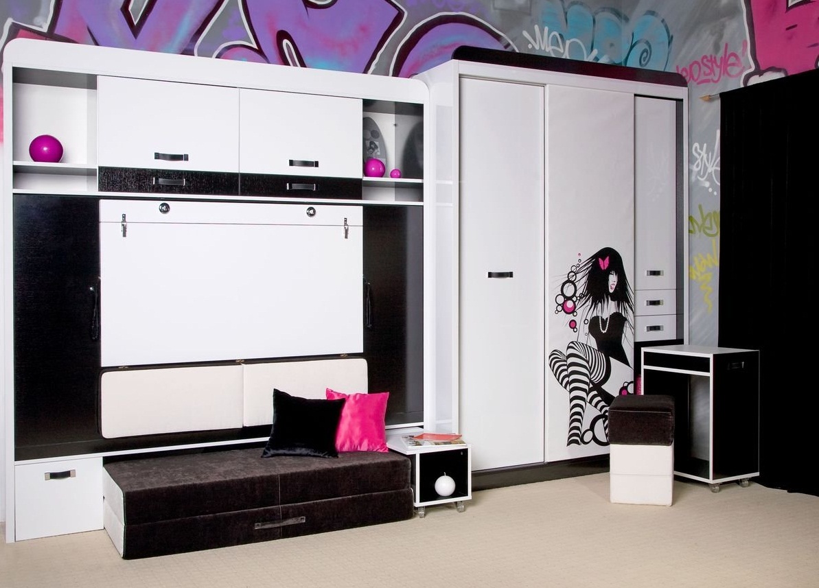A transforming wall made in a classical style is very interesting and attractive from an aesthetic and functional point of view. In appearance, it looks like the most common cabinet furniture with simple and strict lines, but its main surprise is that the bed is pushed from the inside to the outside or in a horizontal, but more often in a vertical way. Usually such a wall is ordered in cases where it is again about the need for an extra bed. Such a “classic” is especially in demand in office premises, when from time to time employees have to stay up late, and thus there is an excellent opportunity for good rest at night.