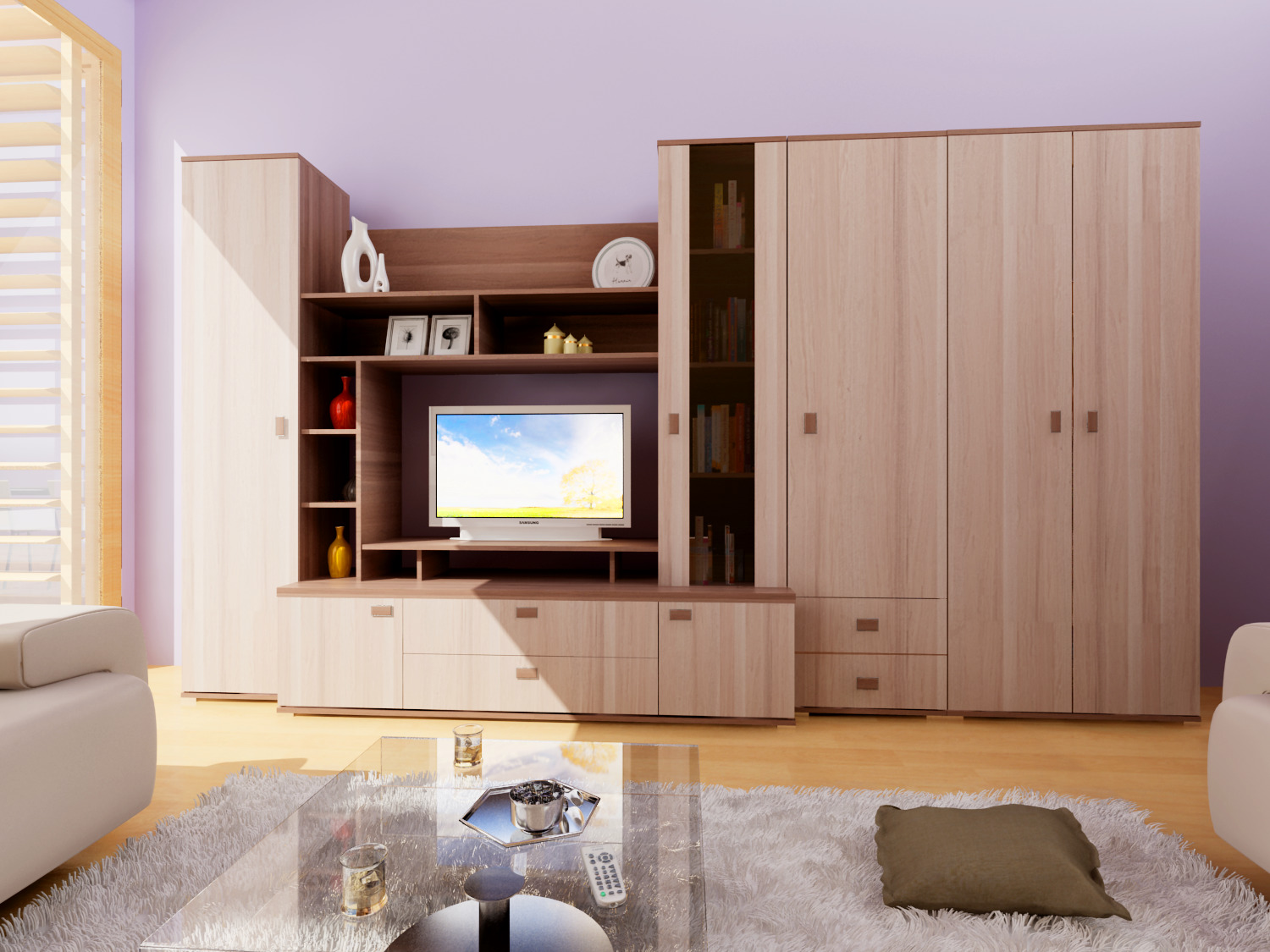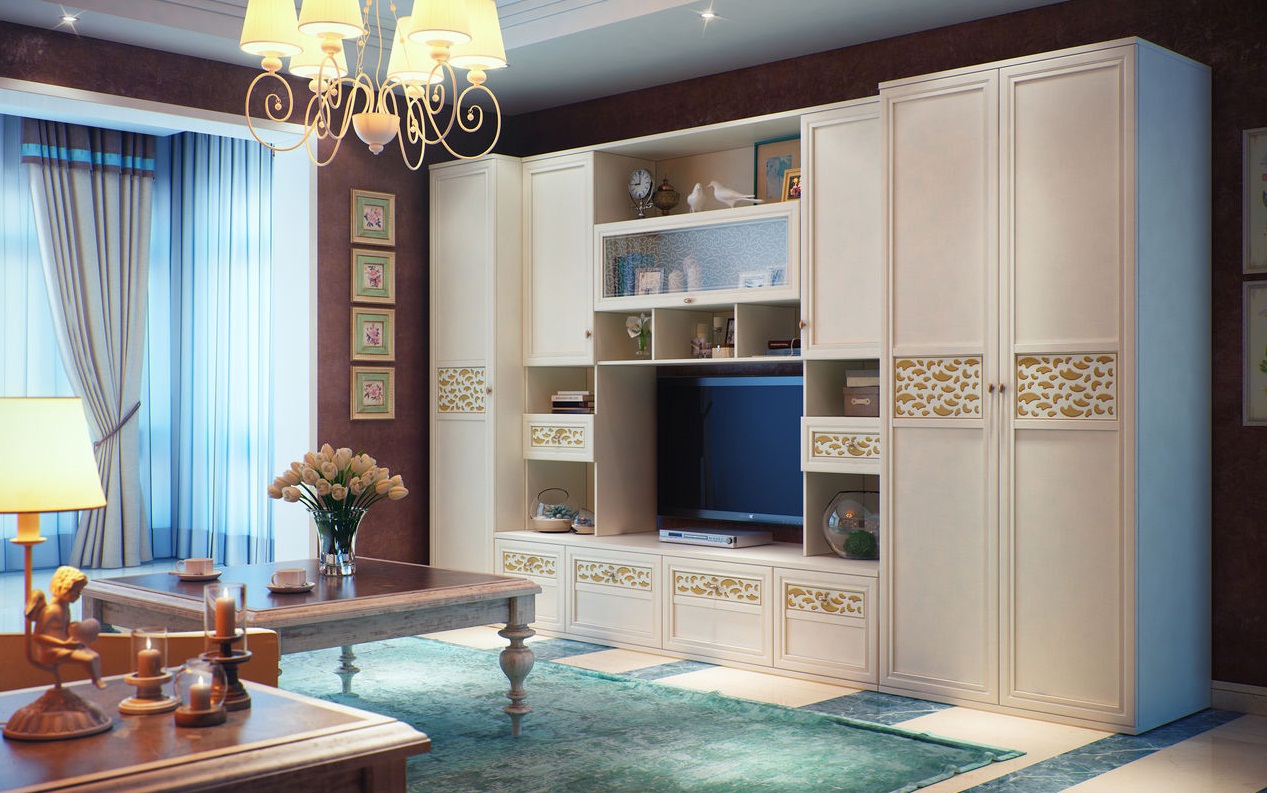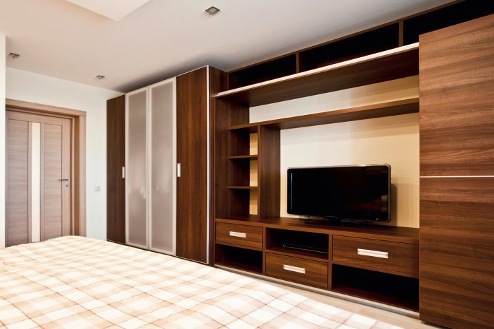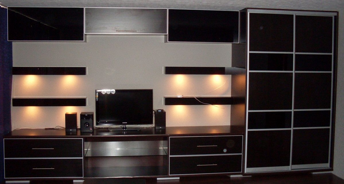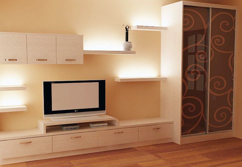 If the wall design is planned properly and with taste, having prepared a drawing in advance, each compartment or module will fulfill its role for storing various things: from clothes to souvenirs. You can build in the wall cabinet under the TV, and the wardrobe to place on any convenient side. Also the construction with a dresser at the bottom and a TV placed at the top will look very functional: thus, the more massive wardrobe compartment will be at the bottom,and in the closet there will be more space to store in it winter clothes and medium-sized household appliances.