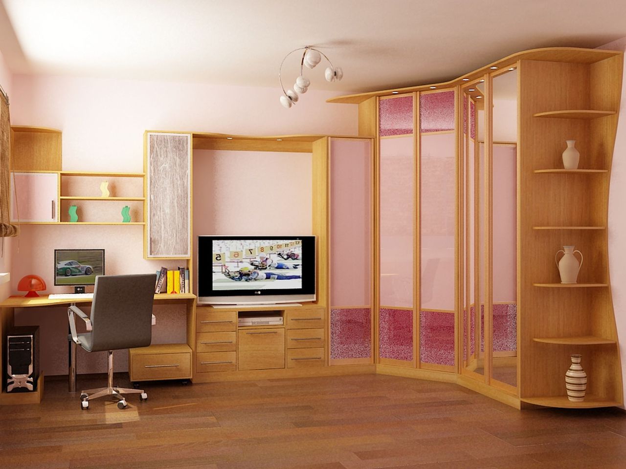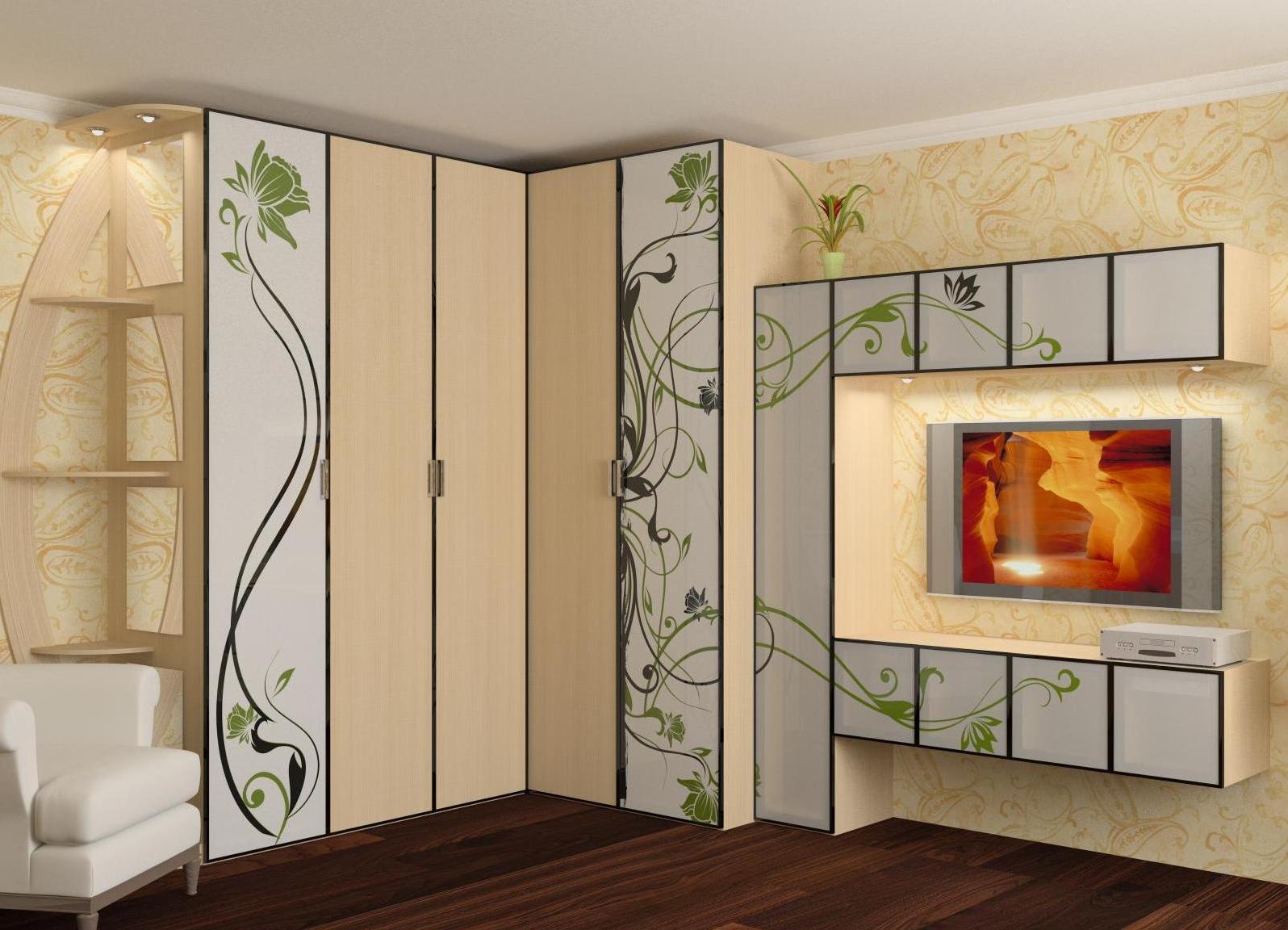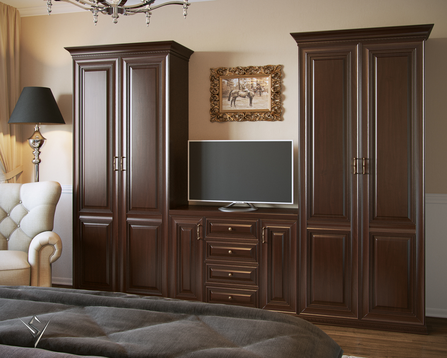 If the wall design is planned properly and with taste, having prepared a drawing in advance, each compartment or module will fulfill its role for storing various things: from clothes to souvenirs. You can build in the wall cabinet under the TV, and the wardrobe to place on any convenient side. Also the construction with a dresser at the bottom and a TV placed at the top will look very functional: thus, the more massive wardrobe compartment will be at the bottom,and in the closet there will be more space to store in it winter clothes and medium-sized household appliances.