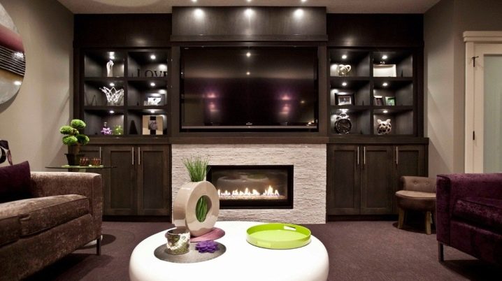 When fireplace in the living room, it can be harmoniously decorated with two cabinets on the sides: both functionally and beautifully. If the ensemble is supplemented with several mantels to match the cabinets and install additional LED lighting to highlight this particular area of the living room, the picture will look whole, unusual and very cozy.