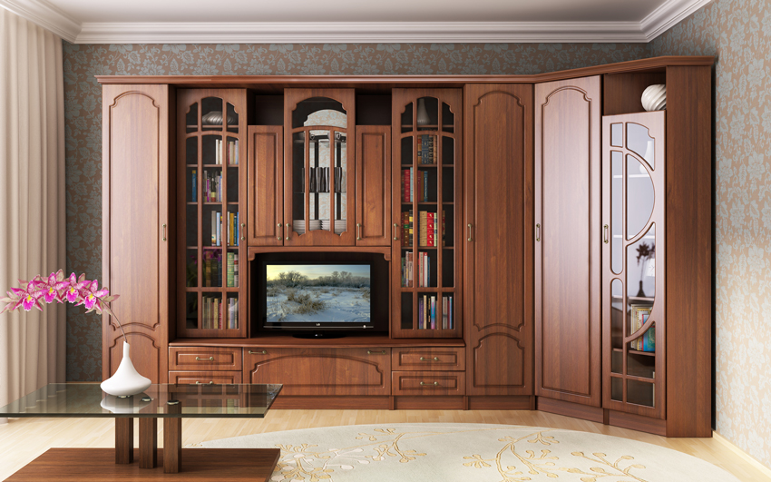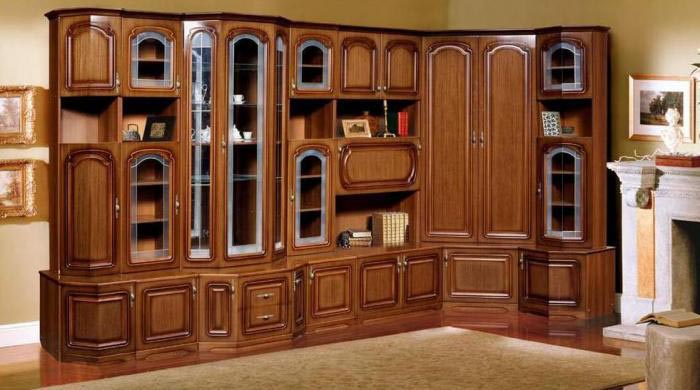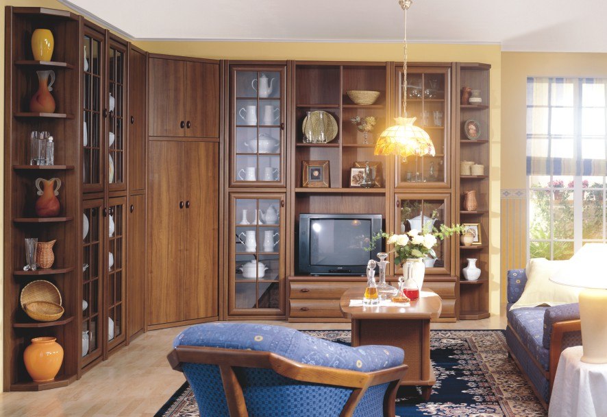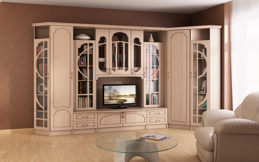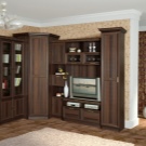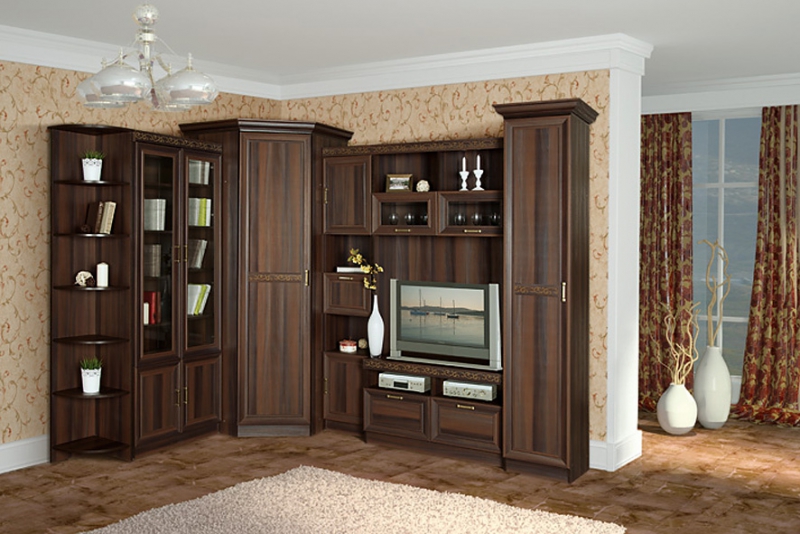 This type of furniture is very practical. It allows you to effectively use all the space of the corner. A small L-shaped wall will be a good choice for a square room of medium size or a room with a non-standard layout. A large corner model is suitable if you need to place a large number of things in it. This option would be appropriate in a spacious living room.