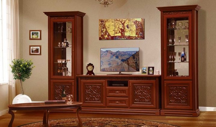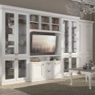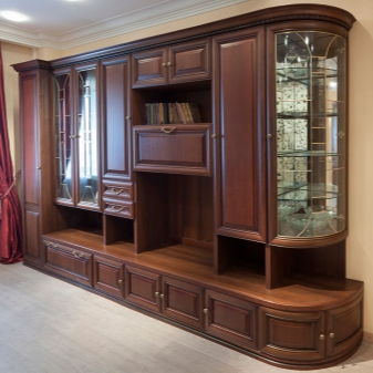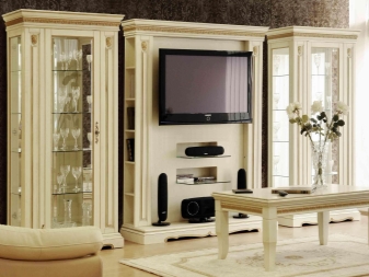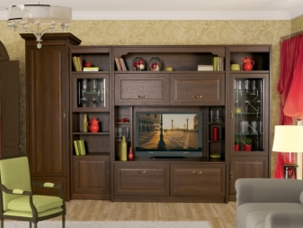 - Variety of options. You can purchase a strict and uncluttered wall in brown tones, or you can decorate the living room with a snow-white set with openwork carving and mirrors. Versions of the classic walls set. The same applies to the size and configuration.