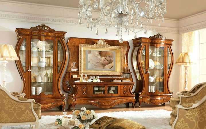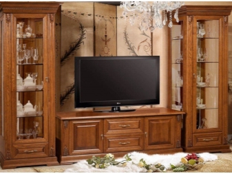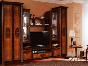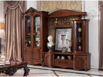 In any case, the decor of the classic walls is chosen with great taste. He does not overload the furniture, but only emphasizes the beauty of the stylistic composition. It can be figured legs, gilding, carving and exquisite patterns on the facades. Also a common feature of such furniture is the symmetry of the location of the sections relative to the center.
